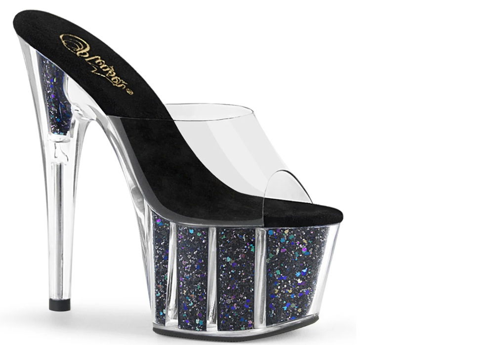 Sandale cu toc de 18 cm si platforma de 7 cu sclipici in platforma. Brand Pleaser USA