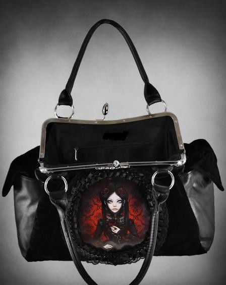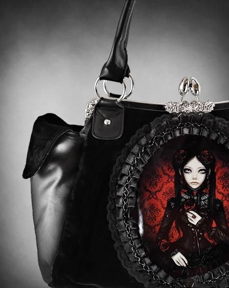 Papusa Rosu Lolita. Realizata din catifea intarita si piele ecologica. Pe partea din fata este imprimat un model digital al unei fete stil gothic, inconjurat de o rama ovala din panglici din dantela si satin. In partile laterale sunt buzunare realizate din piele ecologica. Dimensiuni: Inaltime 29 cm, latime 45 cm, latimea fundului gentii 11 cm, lungime curea de mana 55 cm