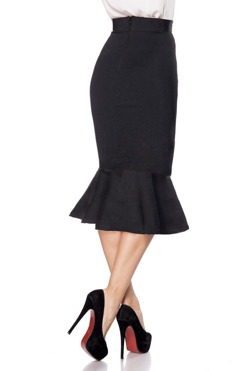 Fusta cu talie inalta, pana la genunchi, stil creion, cu volan. Fusta are fermoar la spate si este realizata dintr-un material elastic. Lungimea fustei, pentru marimea S este de aproximativ 74 cm