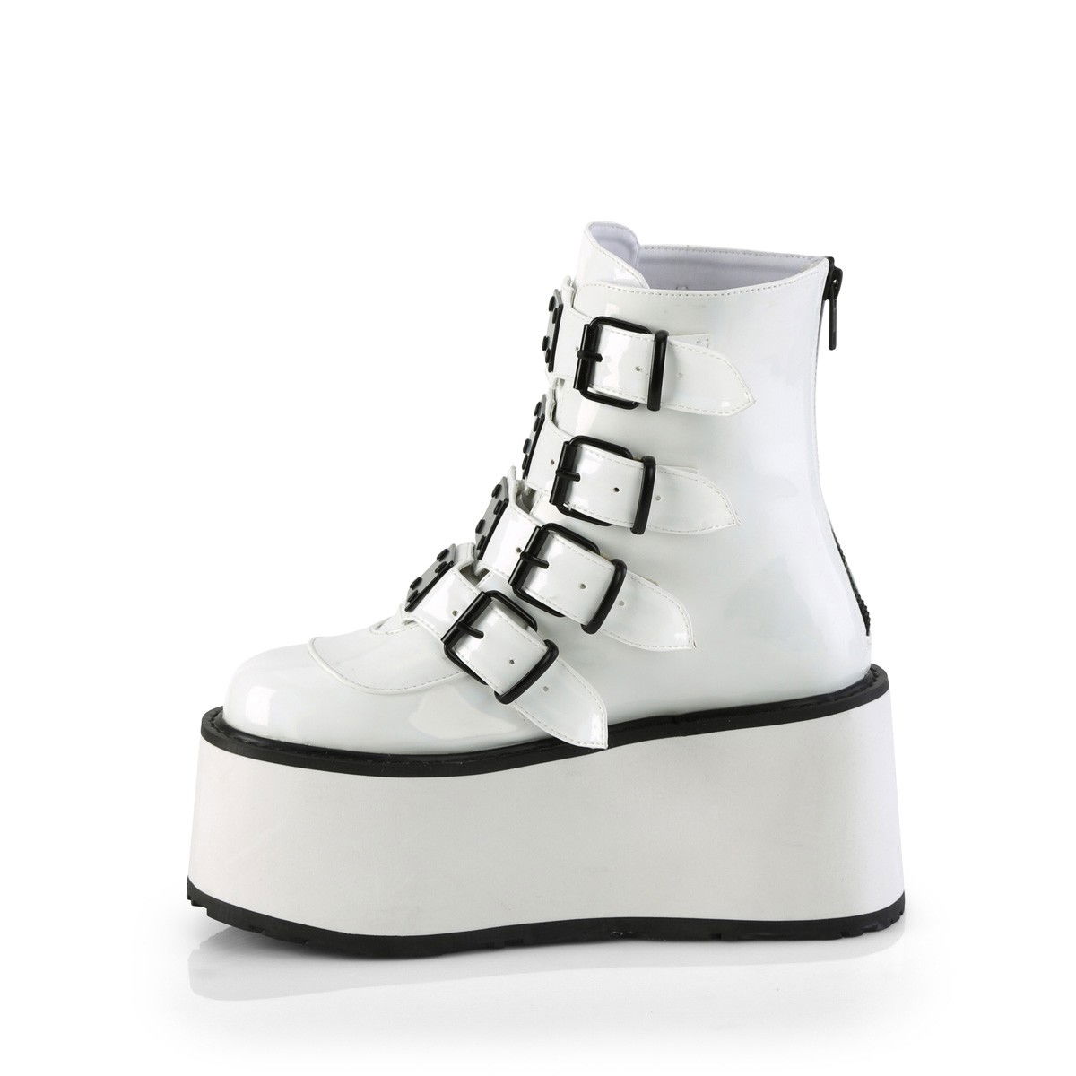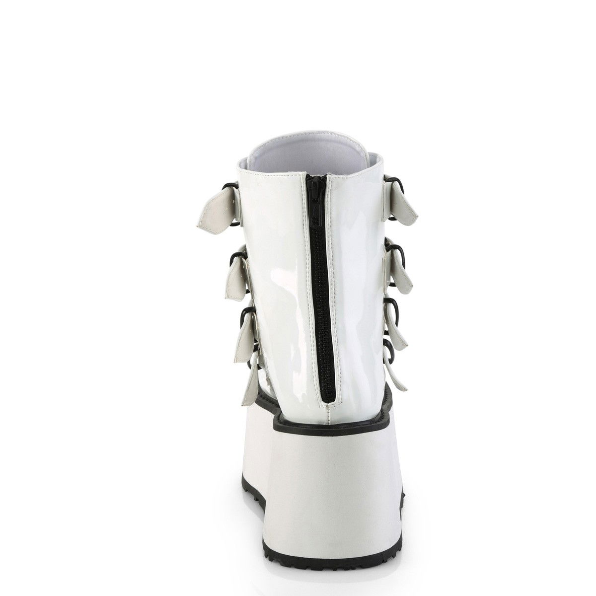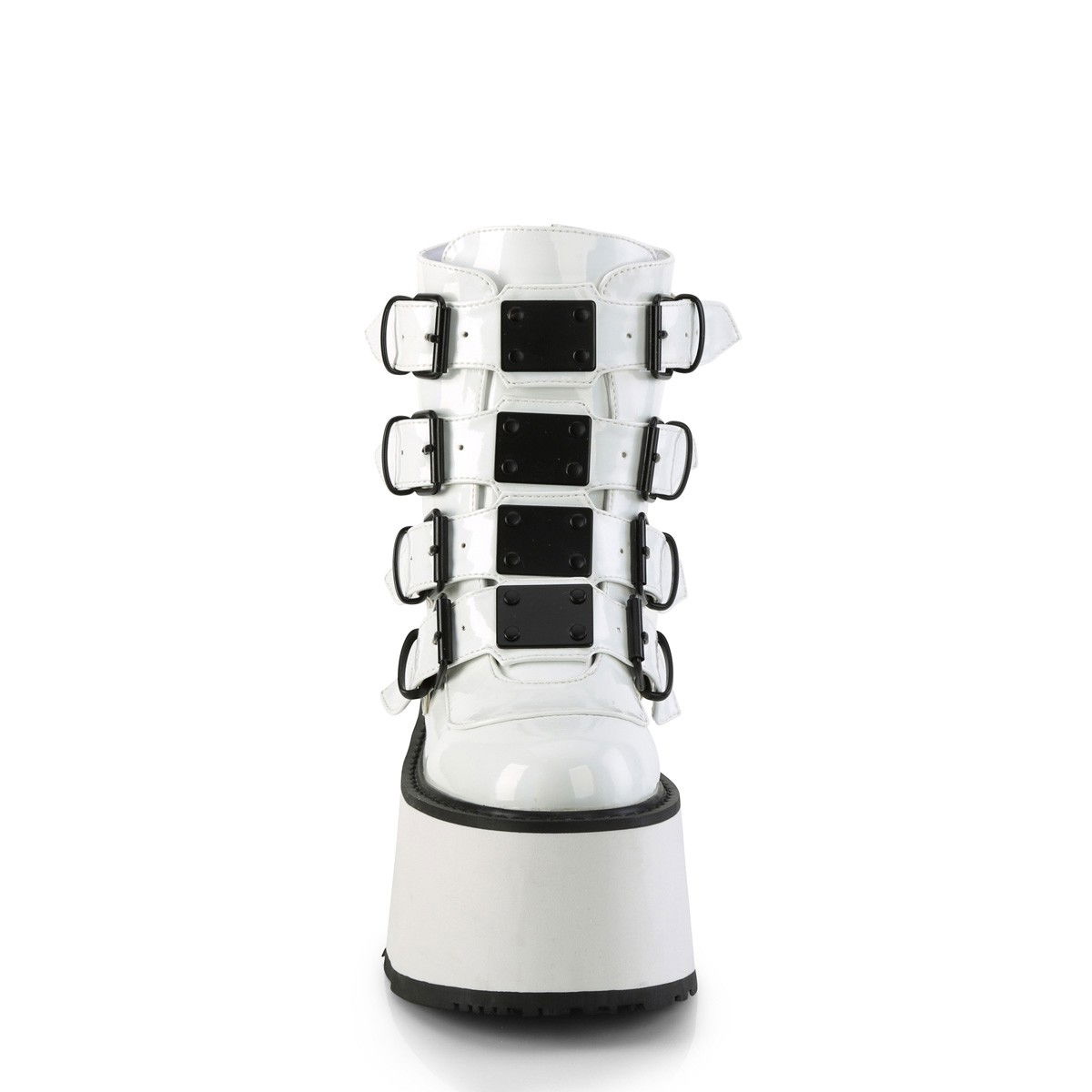Ghete cu talpa lata, cu 4 catarame si placute metalice in partea din fata. Ghetele au culoarea alb holograma si au fermoar la spate. Brand DemoniaCult