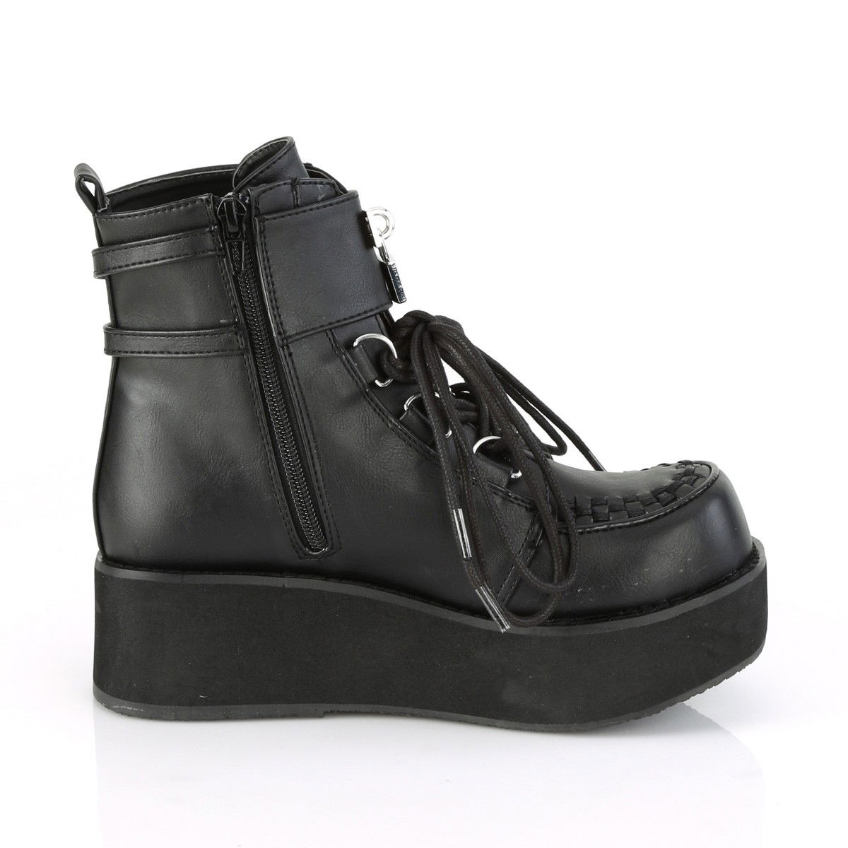 Ghete stil gotic, cu talpa lata, cu catarame decorative pe glezna, lacat in fata, siret in fata si fermoar pe interiorul piciorului. Brand Demonia