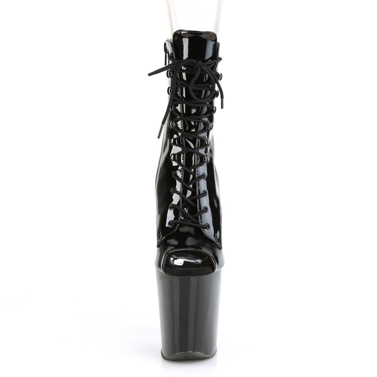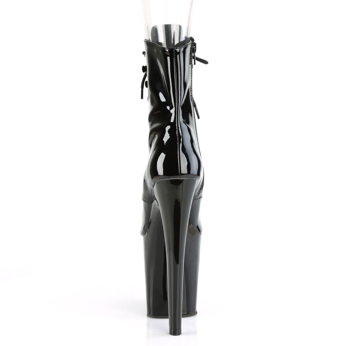 Botine cu toc inalt de 20 cm si platforma de 10 cm, cu siret in fata si varful decupat. Botinele se incheie cu fermoar pe interior. Brand Pleaser