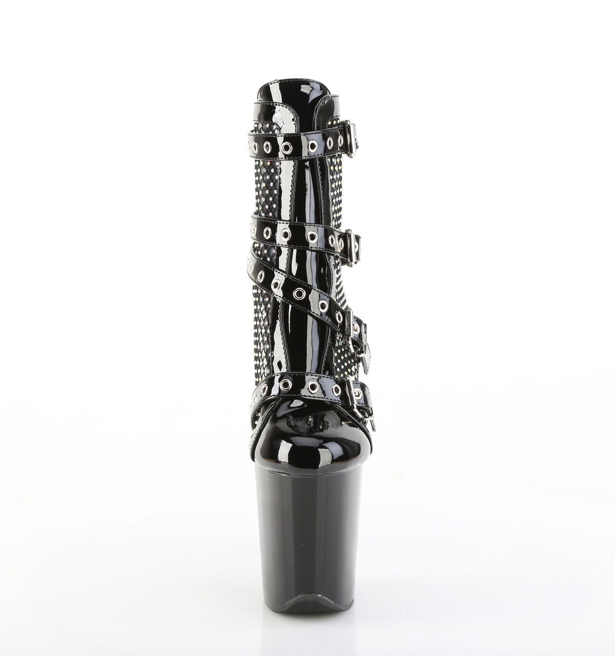 Botine cu toc inalt, de 20 cm si platforma de 10 cm, din lac dar cu partea superioara semi-transparenta, cu patru barete cu catarame. Botinele au fermoar la spate. Acest model de botine este perfect pentru dans la bara, poledance, pentru dansatoare sau animatoare, in club, dar si pentru videochat. Brand Pleaser USA