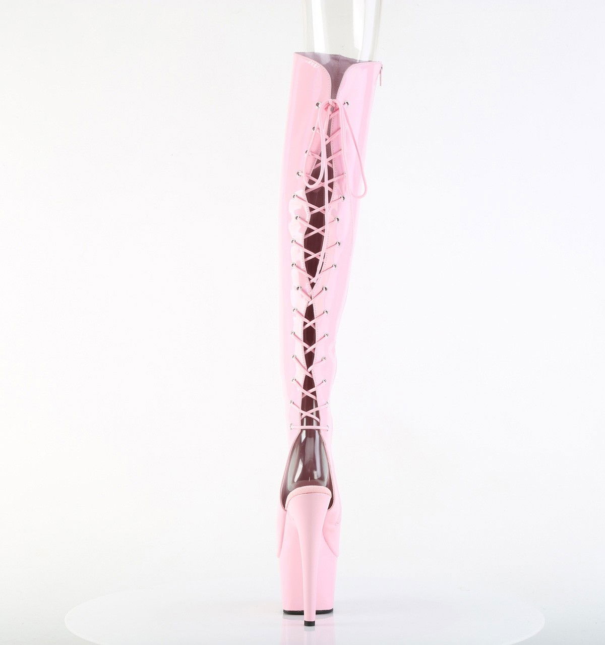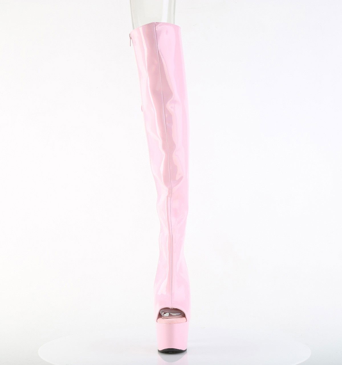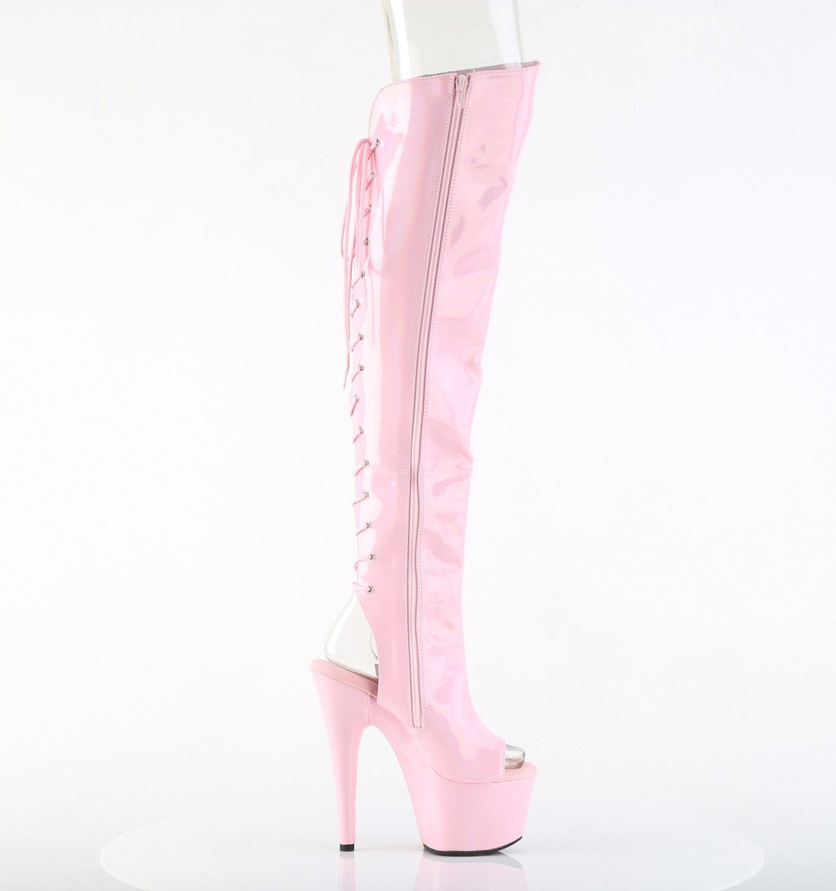 Cizme roz, pentru dansatoare, model holografic, cu toc inalt de 17.8 cm si platforma de 7 cm, calcaiul decupat, cu fermoar pe interior. Brand Pleaser.