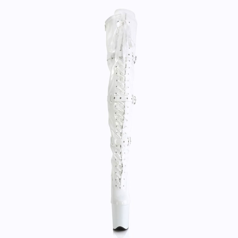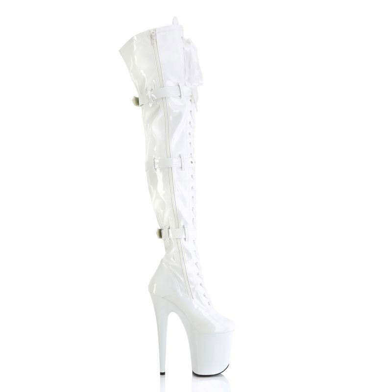 Cizme pole dance albe Pleaser Flamingo 3028, cu toc de 20 cm și platformă înaltă brand Pleaser USA. Perfecte pentru apariții senzuale și show-uri de impact.
