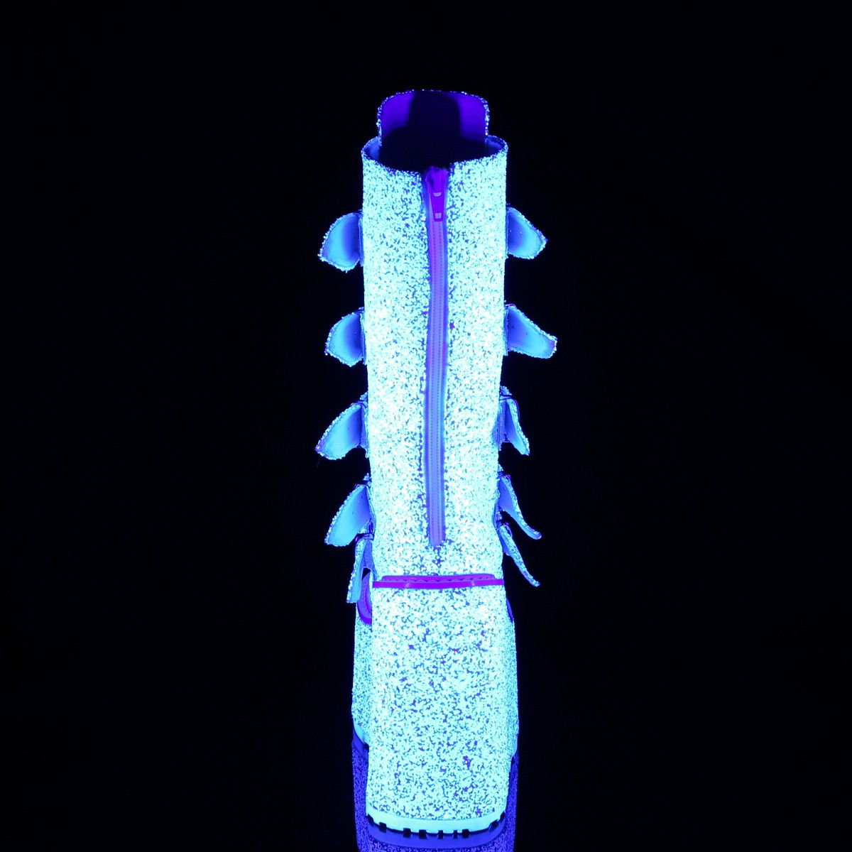Ghete inalte brand Demonia, stil gotic si Mary Jane, cu talpa ortopedica, cu siret si catarame, detalii metalice in forma de inimioare. Ghete sunt din piele ecologica culoare alb neon