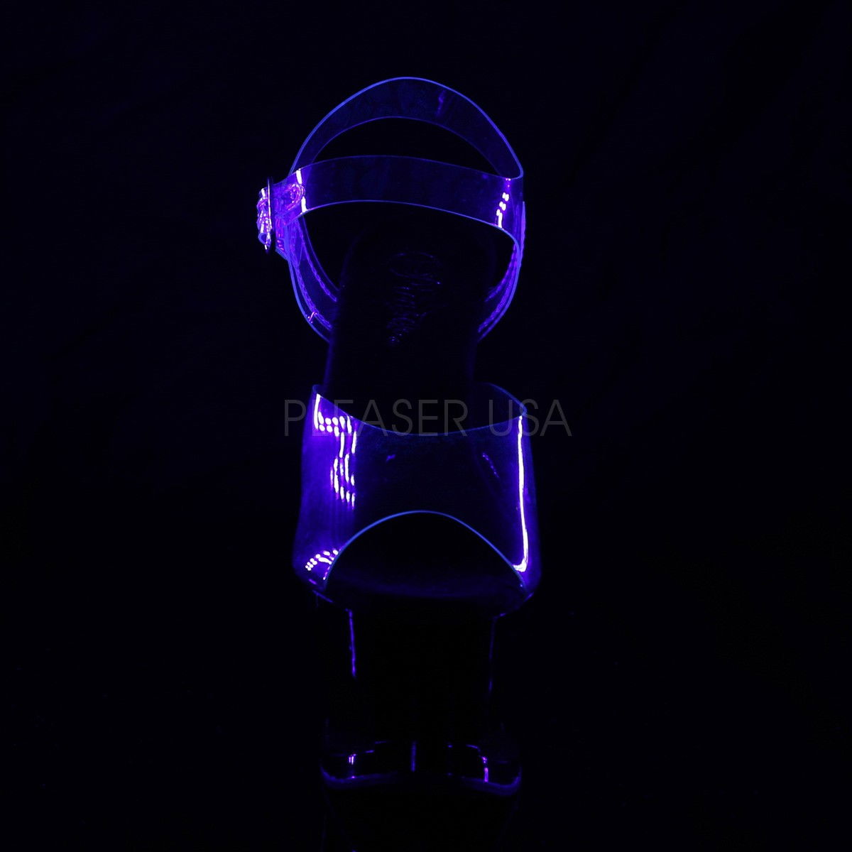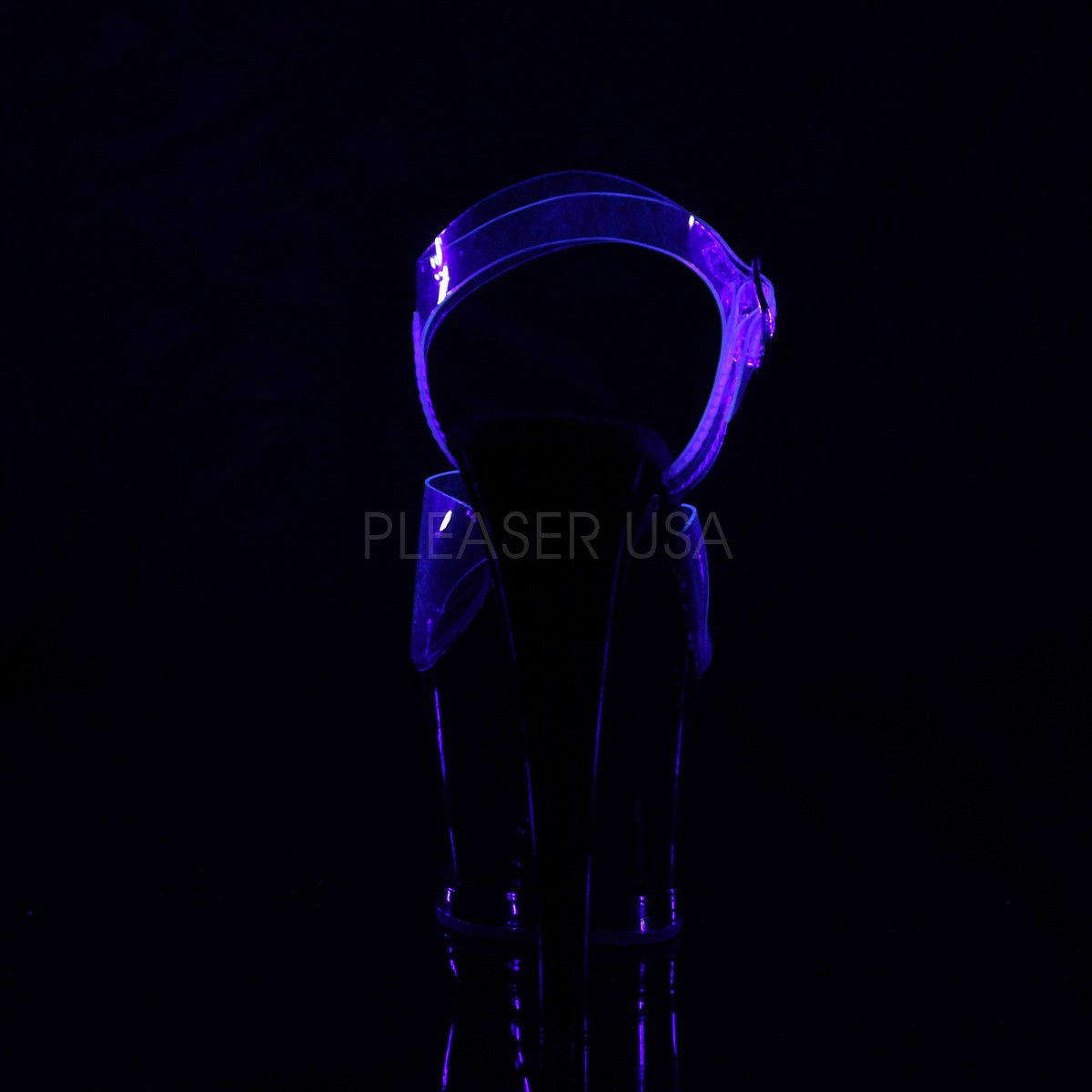 Sandale cu platforma decupata, inalta, cu toc inalt, cu piele intoarsa pe talpa, cu barete din silicon. In pplatforma inclus model pisica culoare neon. Brand Pleaser