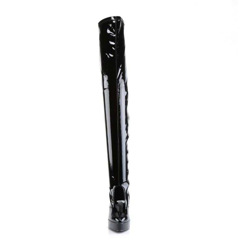 Cizme negre lac peste genunchi cu toc de 13.2 cm și platformă de 3.1 cm, ideale pentru un look sexy și spectaculos. Brand Pleaser USA