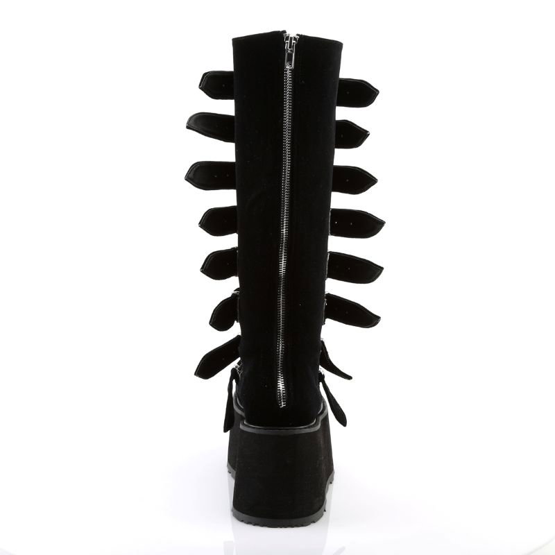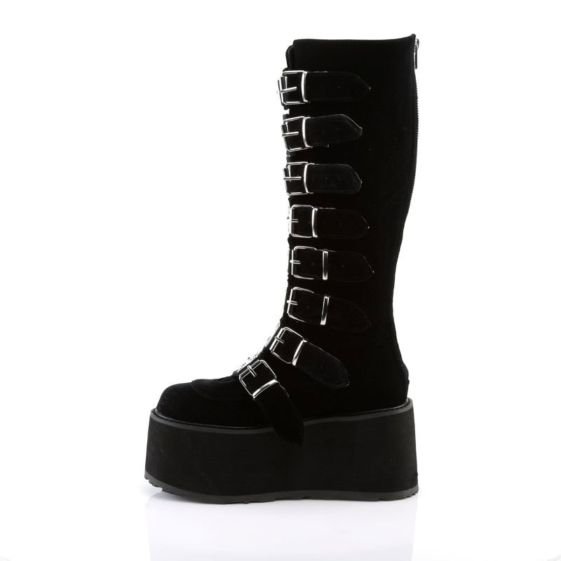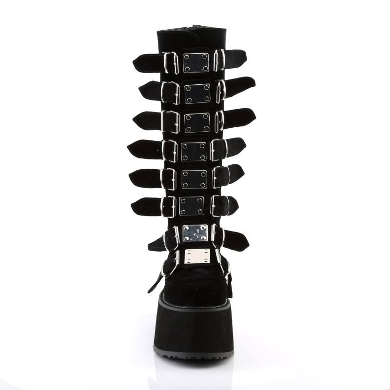 Cizme gothic DAMNED 318 din catifea neagră, cu platformă de ~9 cm și design până la genunchi. Model DemoniaCult cu barete multiple, catarame metalice și fermoar la spate. Look premium, stabilitate și impact vizual puternic.