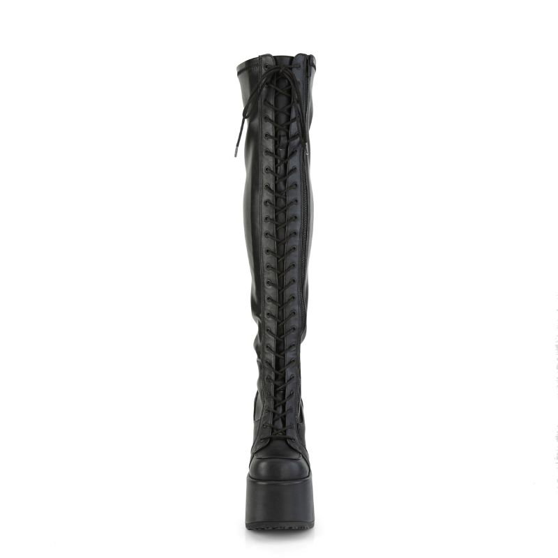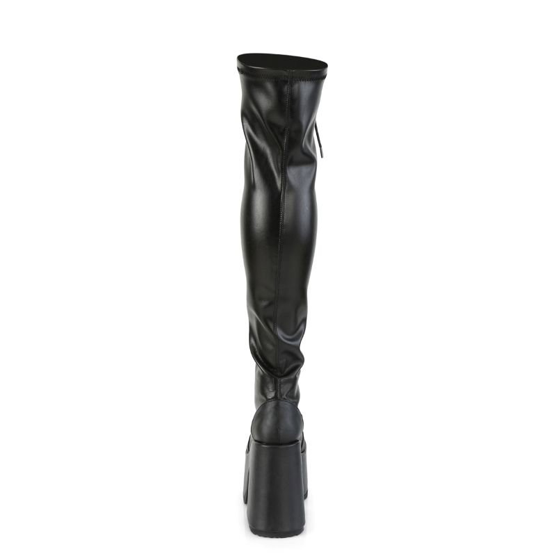 Cizme peste genunchi CAMEL 300 negru mat de la Demonia, cu platformă și toc gros pentru stabilitate și stil alternativ. Finisajul mat oferă un look mai discret, dar la fel de puternic vizual. Brand DemoniaCult
