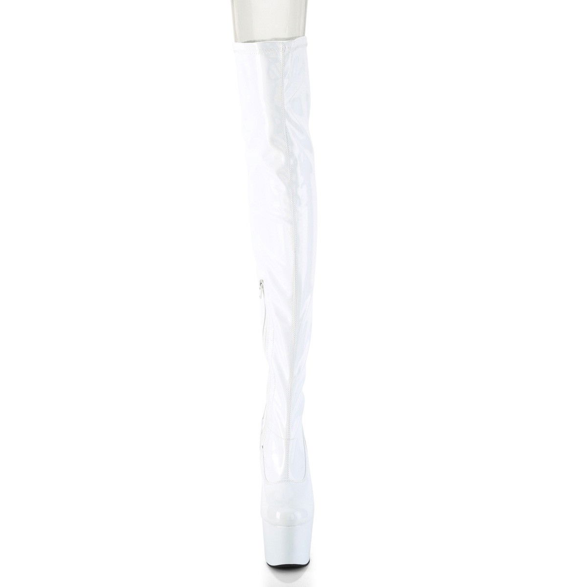 Cizme peste genunchi, din lac cu reflexe holograma, cu toc inalt de 17.8 cm si platforma de 7 cm. Cizmele au fermoar pe jumatate, pe interiorul piciorului. Brand Pleaser