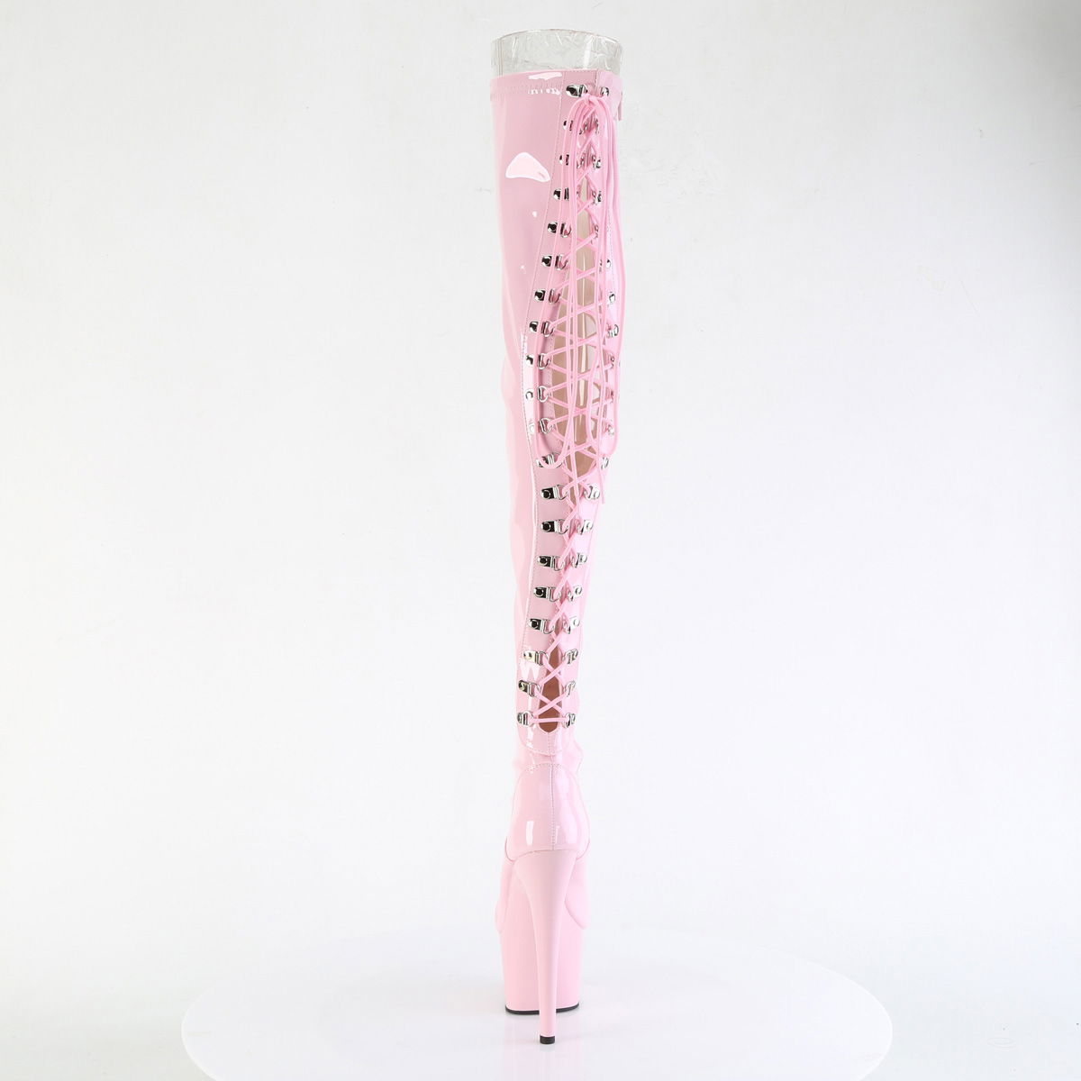 Cizme lungi peste genunchi, roz, cu platforma inalta. Cizmele au siret si fermoar pe interior si au platforma inalta. Cizme pentru pole dance brand Pleaser USA