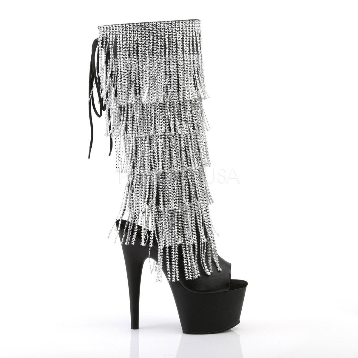 Cizme cu platforma inalta si toc inalt, pentru dansatoare. Botine cu franjuri cu pietricele, cu fermoar pe interior.