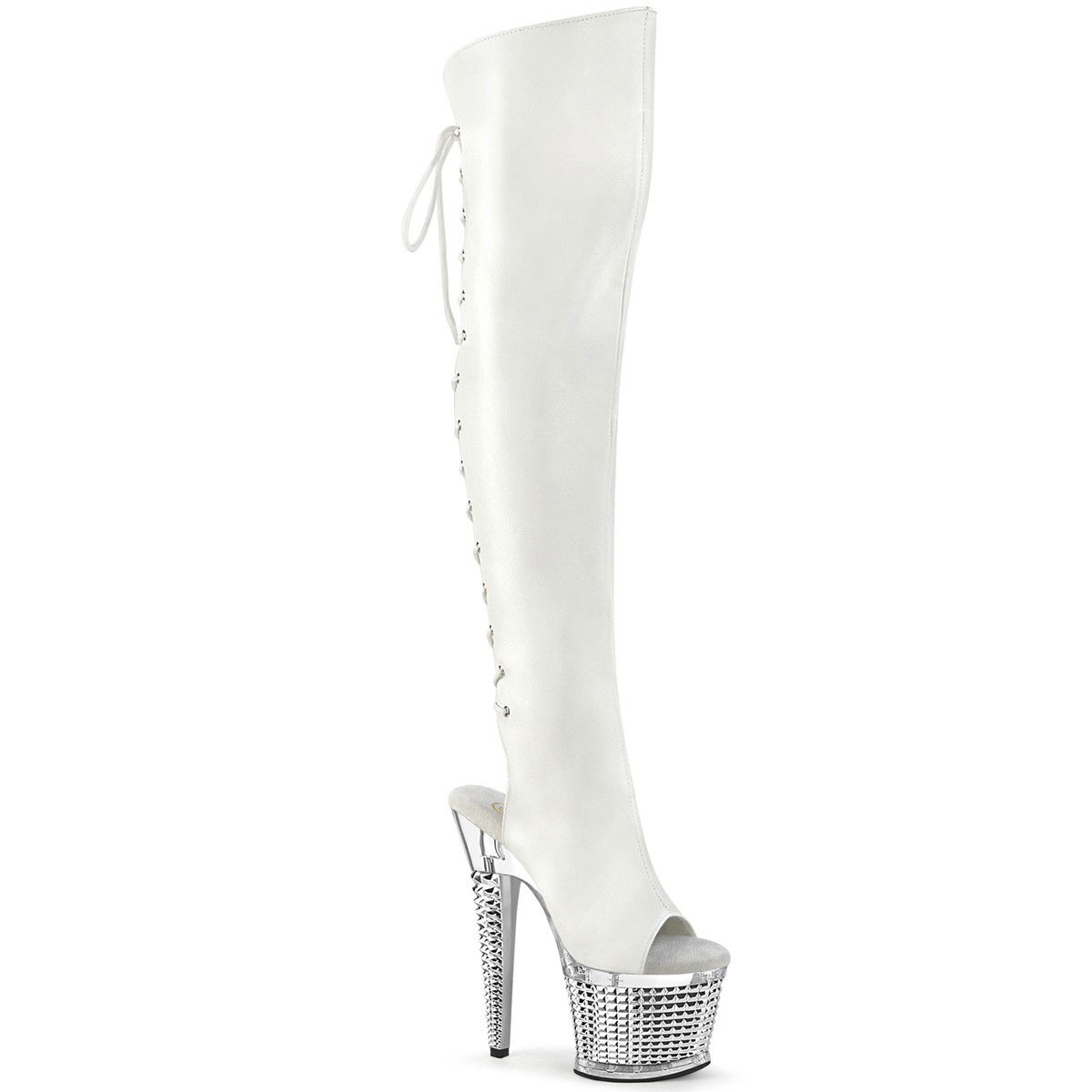 Cizme pentru dansatoare, din piele ecologica, cu toc inalt si platforma inalta texturate, cu varful si calcaiul decupat cu fermoar pe interior. Brand Pleaser.