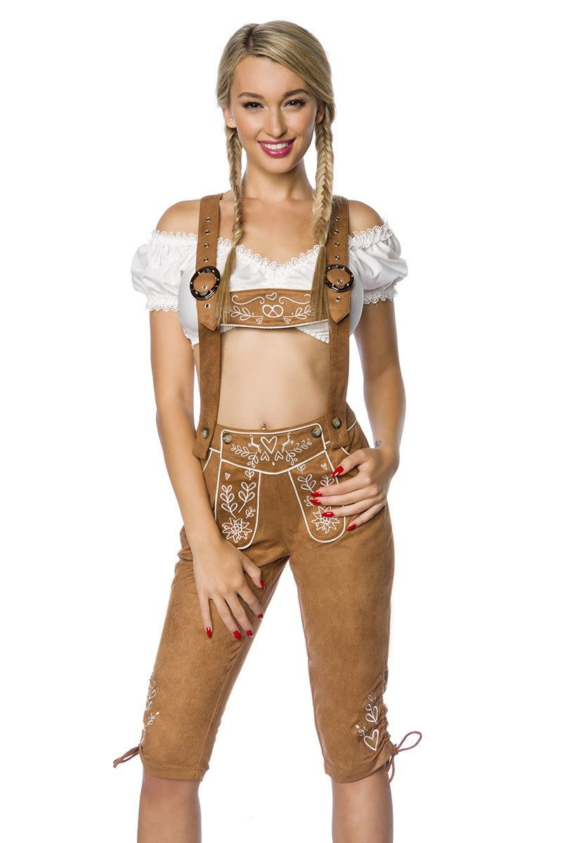 Costum Dirndl salopeta, cu pantalon, din material care imita pielea de caprioara. Are broderii contrastante, cu buzunare in fata si catarame metalice traditionale. Lungimea costumului, pentru marimea XS este de aproximativ 64 cm.