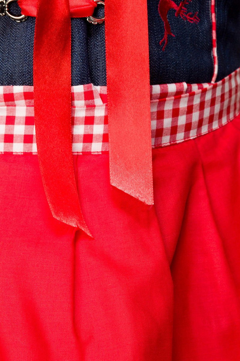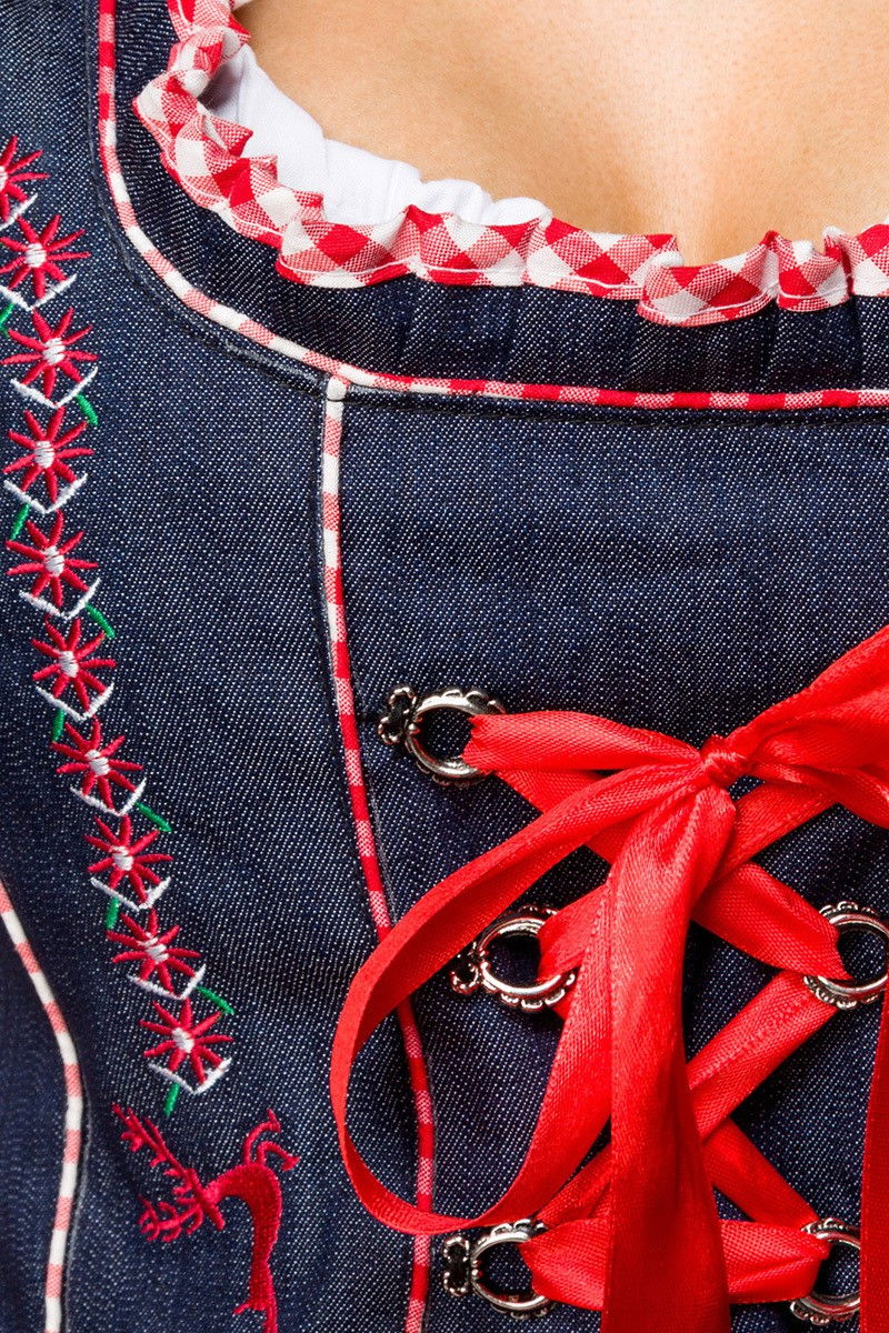 Costum Dirndl cu bluza din denim, fusta si sort, realizat intr-o armonie de culori cu broderii. Bluza are volane si dantela.