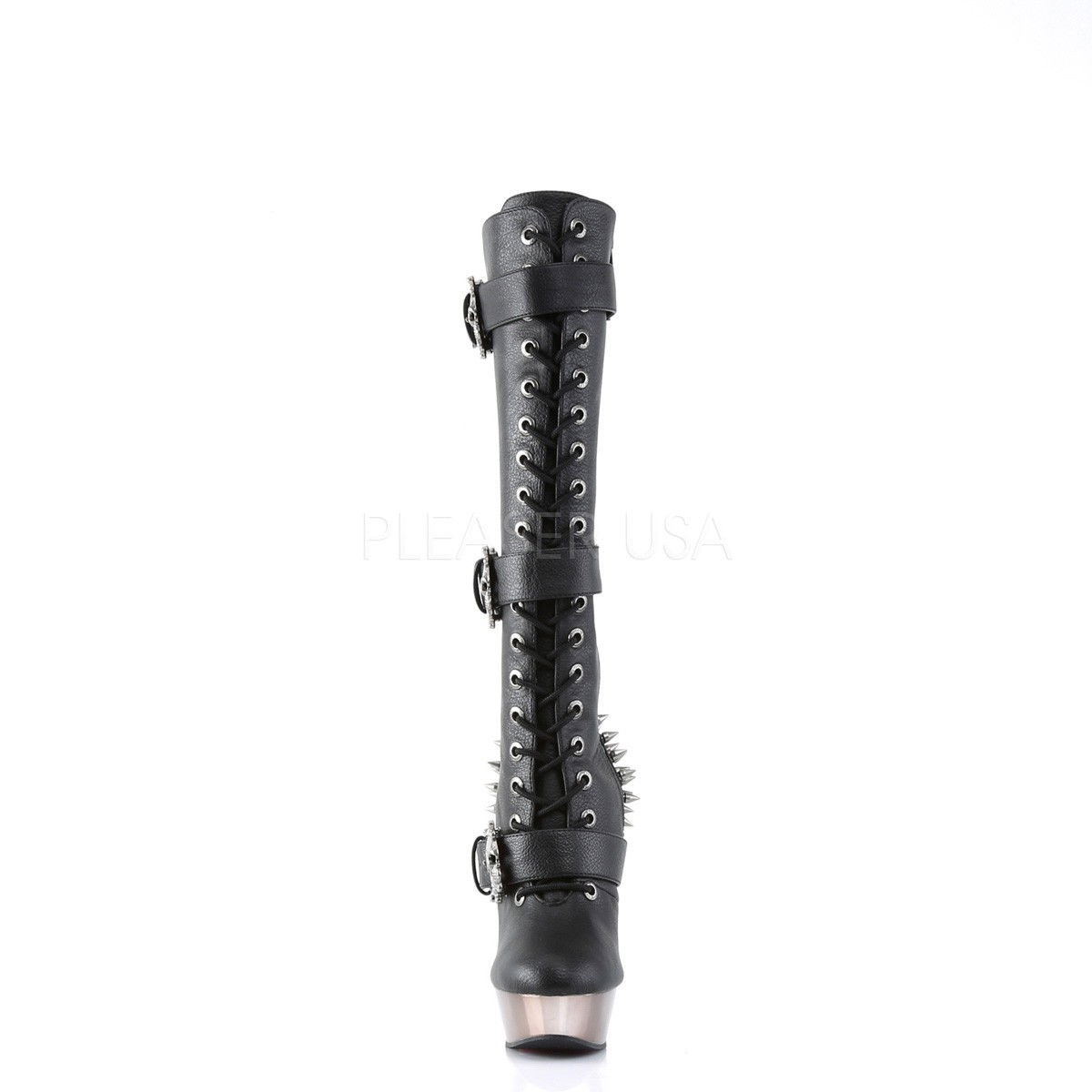 Cizme stil gotic, cu platforma mica, toc inalt, cu catarame model craniu, fermoar pe interior, din piele ecologica. La calcai au tinte metalice. Brand Demonia