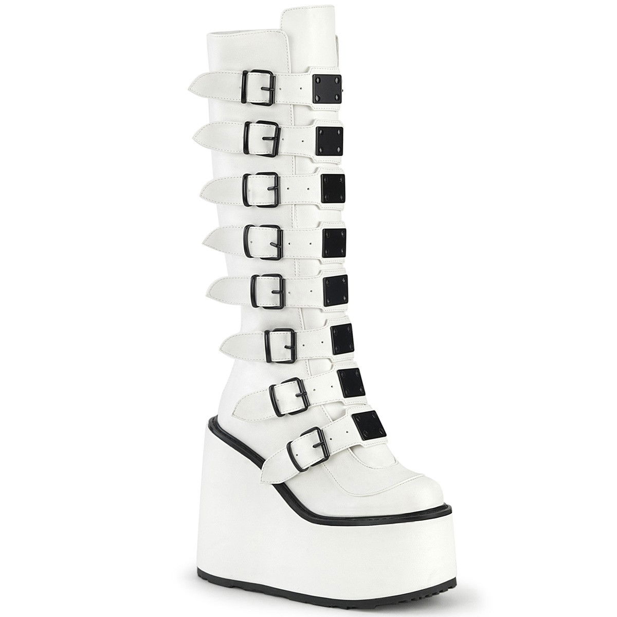 Cizme cu platforma inalta, fara toc, cu catarame, din piele ecologica lacuita de culoare alba. Brand Demonia