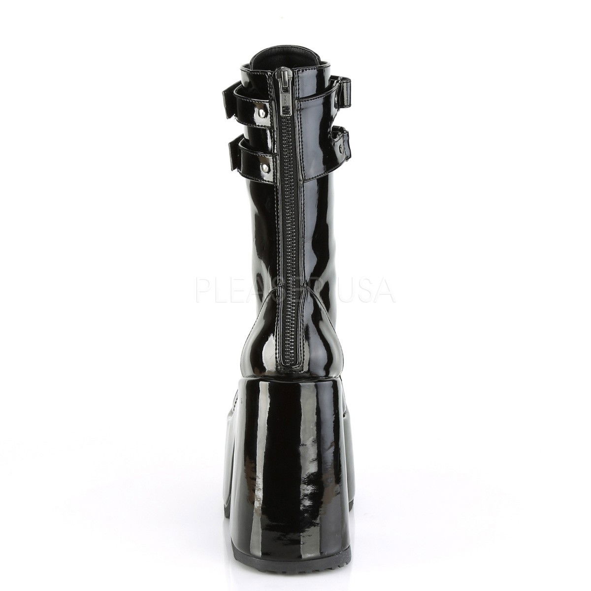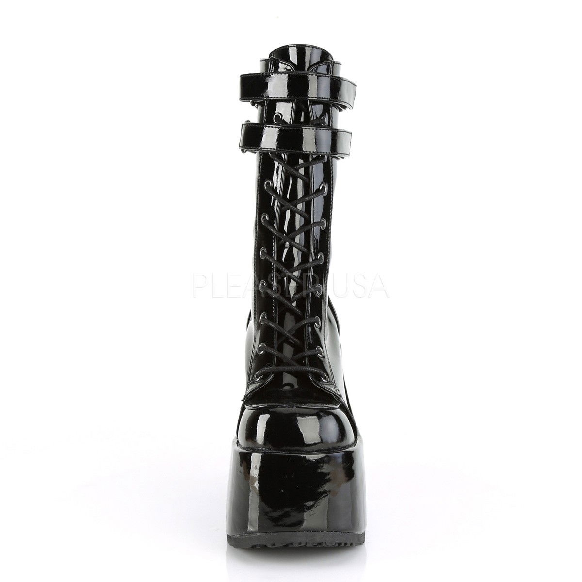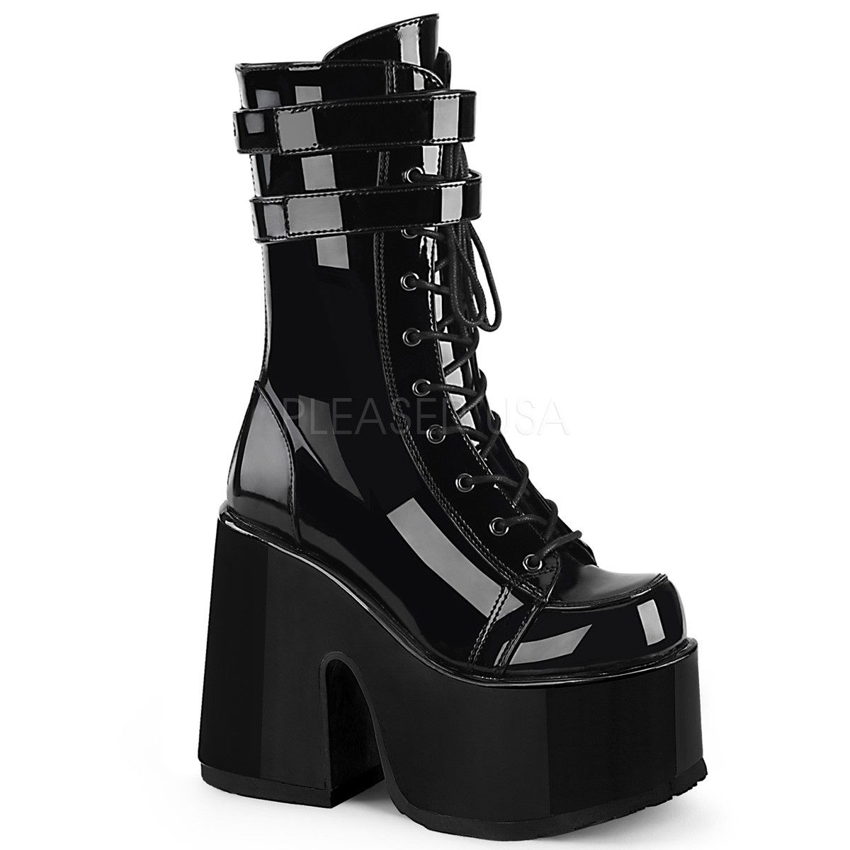 Ghete din lac, cu toc gros si platforma inalta, cu siret in fata si fermoar la spate stil gotic. Ghetele au doua barete in partea superioara. Brand DemoniaCult