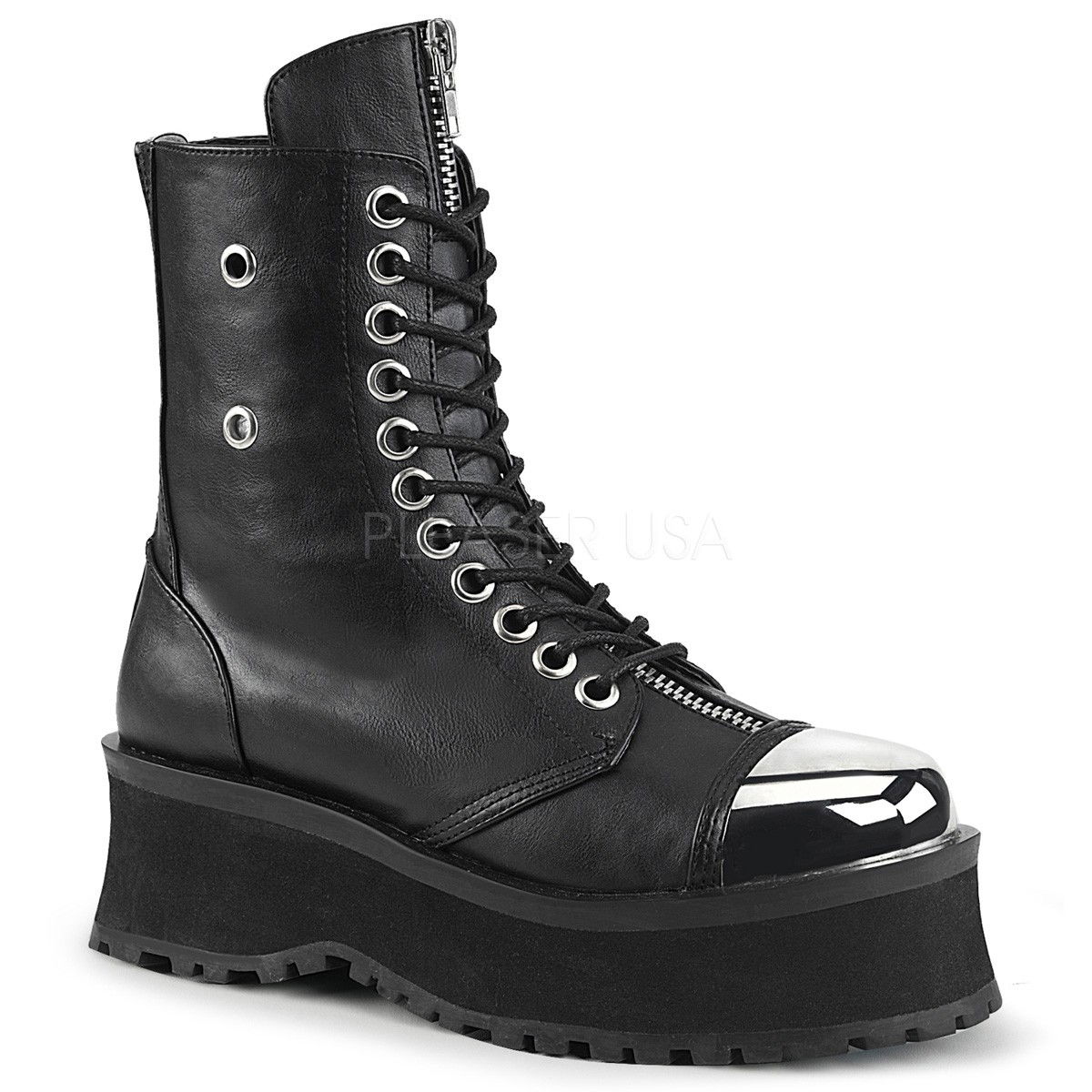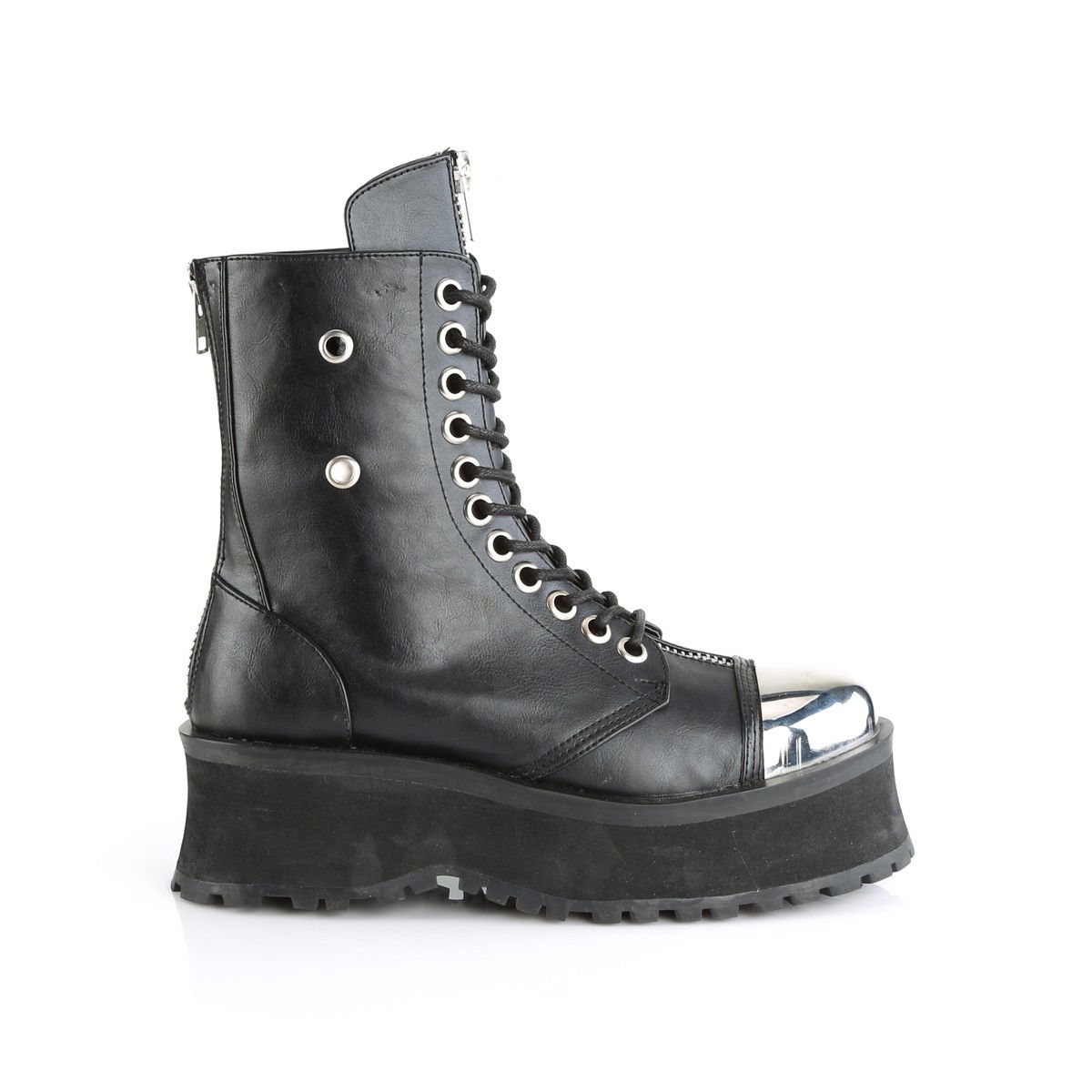 Ghete cu talpa lata, stil gotic, cu fermoar in fata si aplicatii metalice. Varful este metalic, iar pe interior ghetele se incheie cu fermoar. Brand Demonia