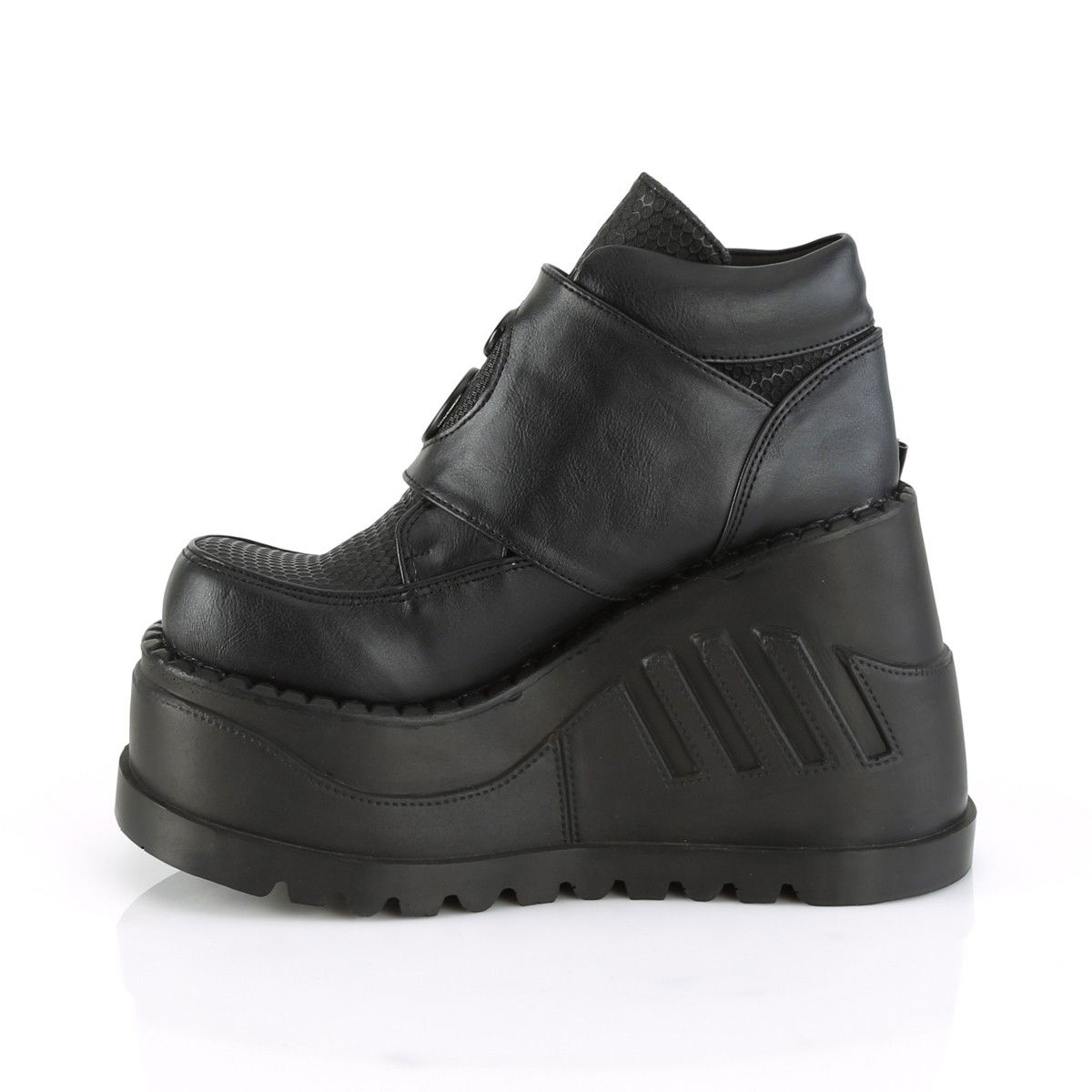 Ghete cu talpa inalta si ortopedica, cu doua catarame, din piele ecologica, stil gotic. Brand Demonia