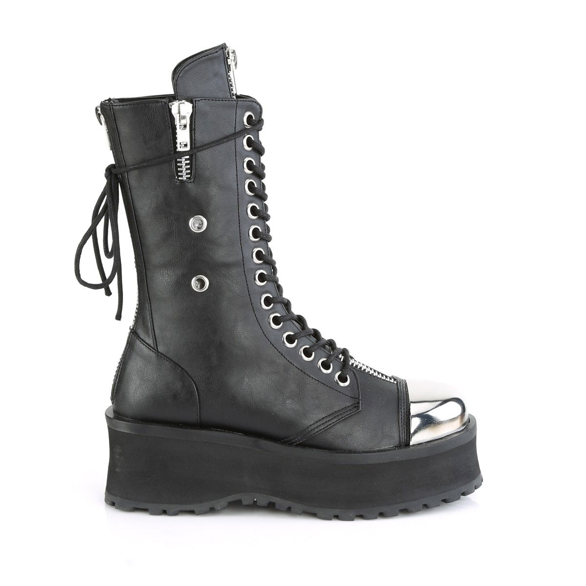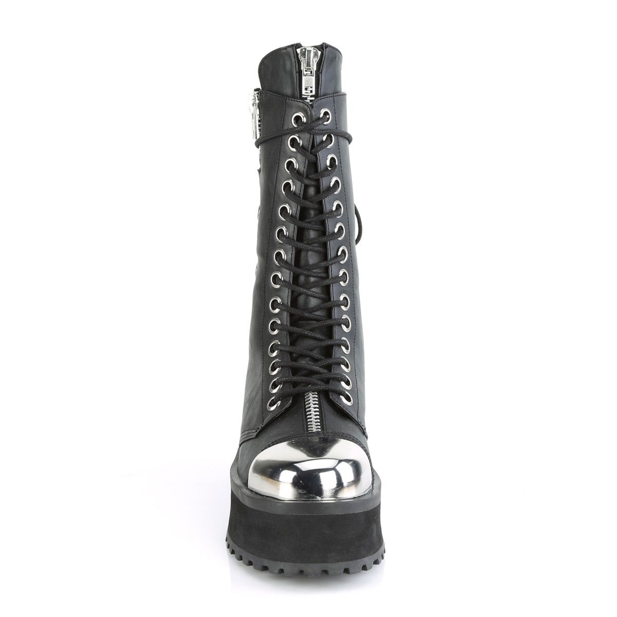 Ghete cu talpa lata, stil gotic, cu siret in fata si aplicatii metalice. Varful este metalic, iar la spate ghetele se incheie cu fermoar. Brand Demonia
