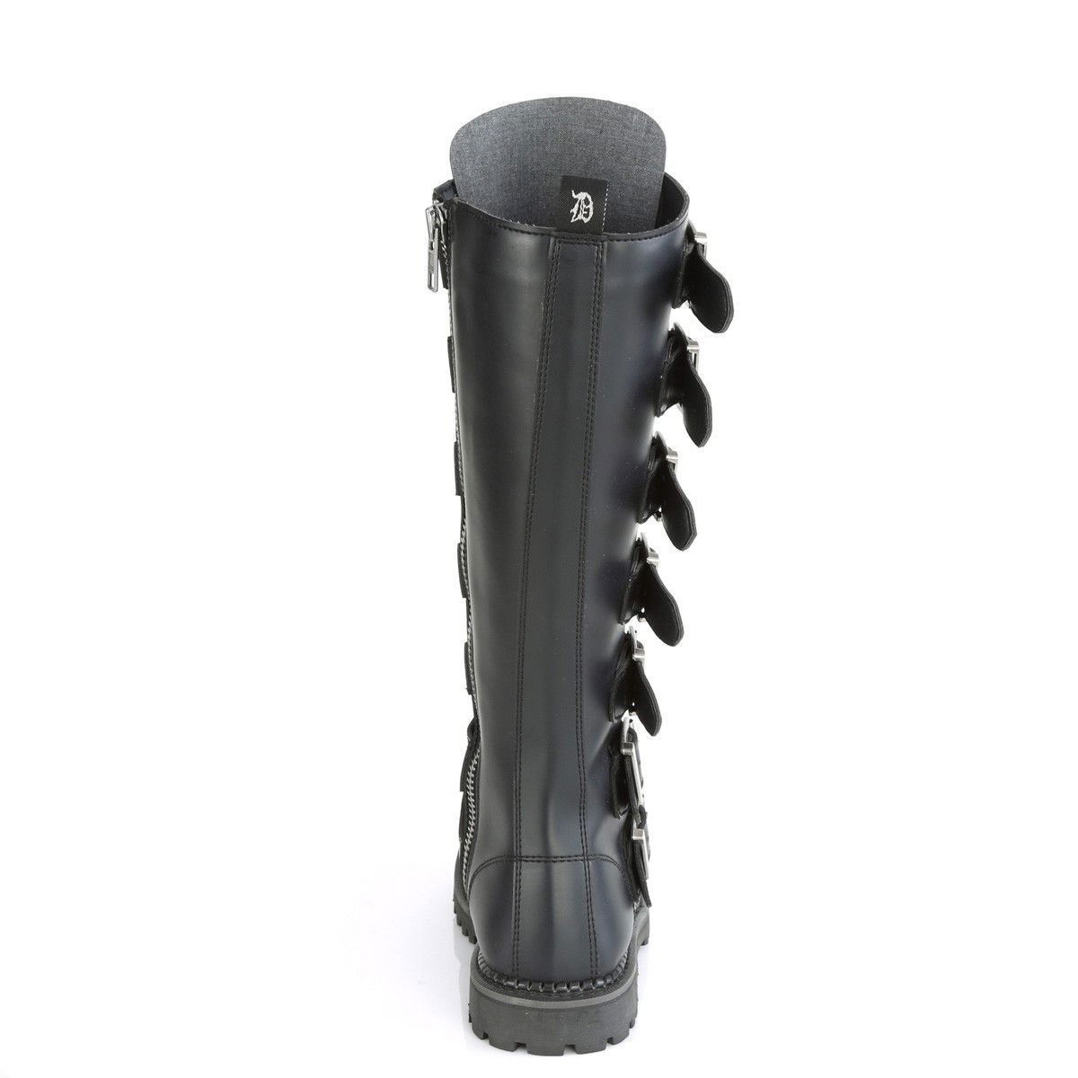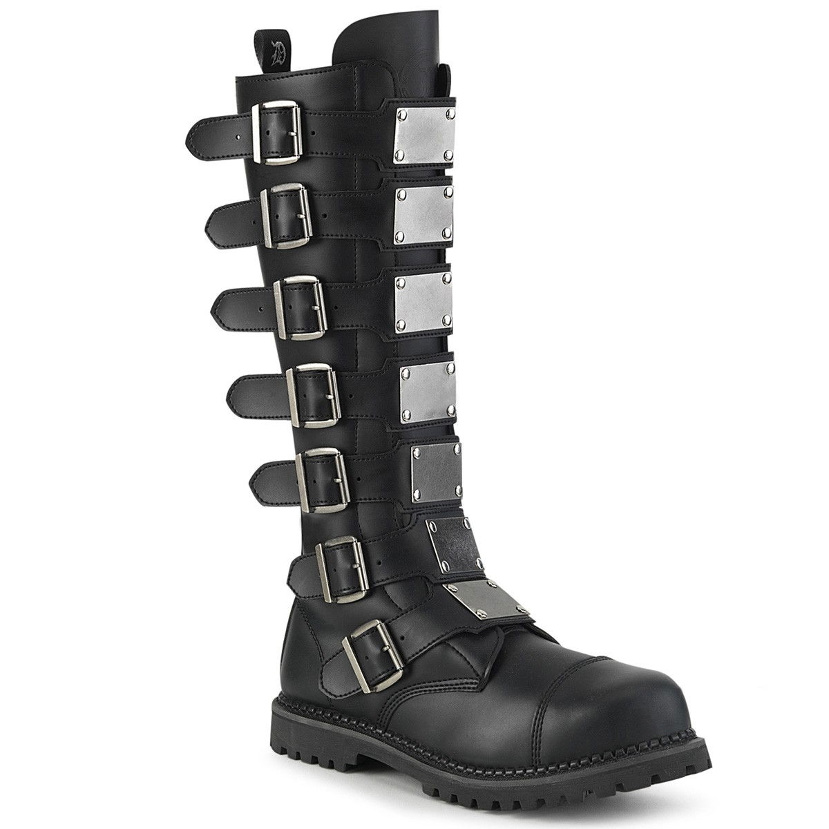 Ghete barbati, cu 7 barete cu catarame si accesorii metalice in fata, din piele ecologica, cu fermoar pe interiorul piciorului, stil gotic, de motocicleta. Brand Demonia