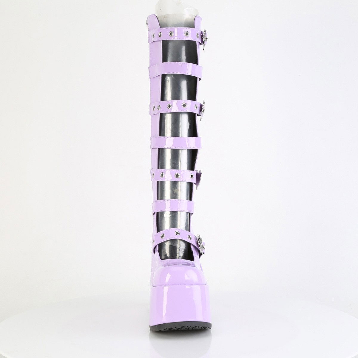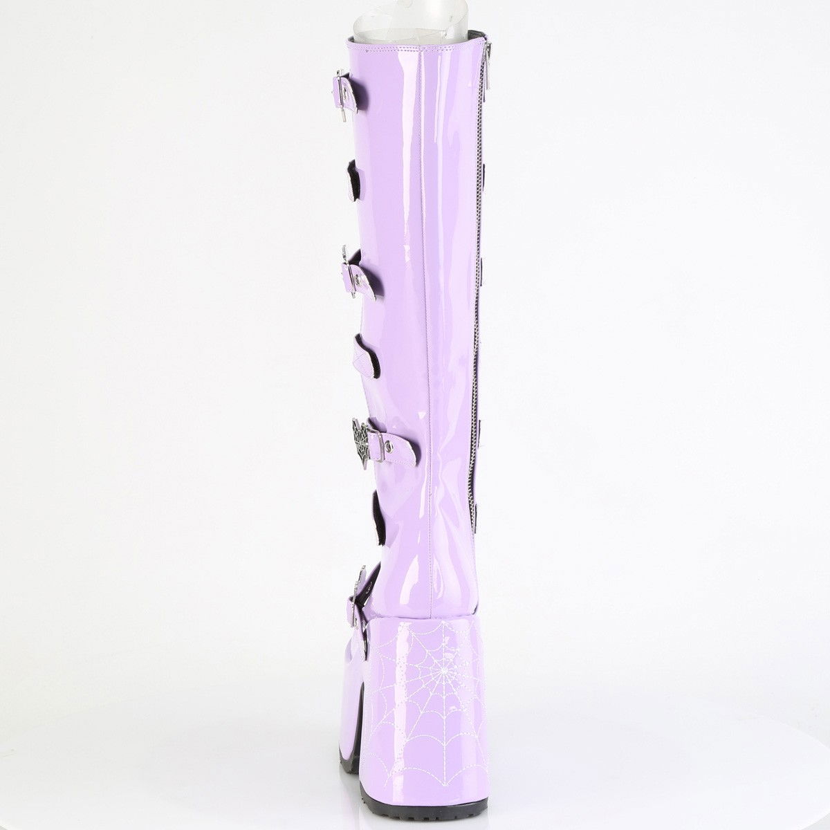 Cizme tip sandale, cu 7 barete cu catarame in forma de inima cu panza de paianjen, cu toc gros cu platforma inalta si fermoar pe interiorul piciorului. Cizmele sunt de culoare mov, iar pe toc au model panza de paianjen alb neon. Brand DemoniaCult