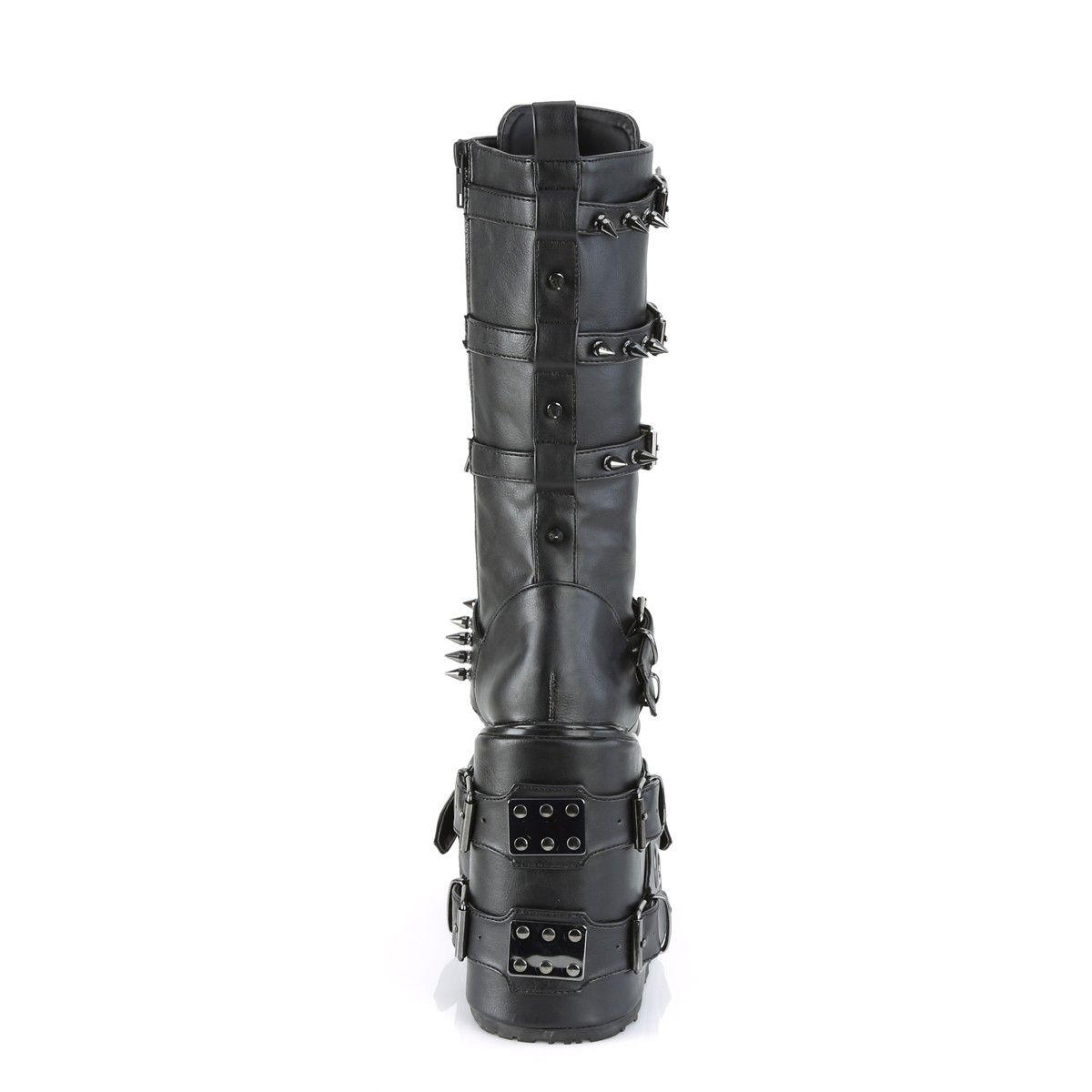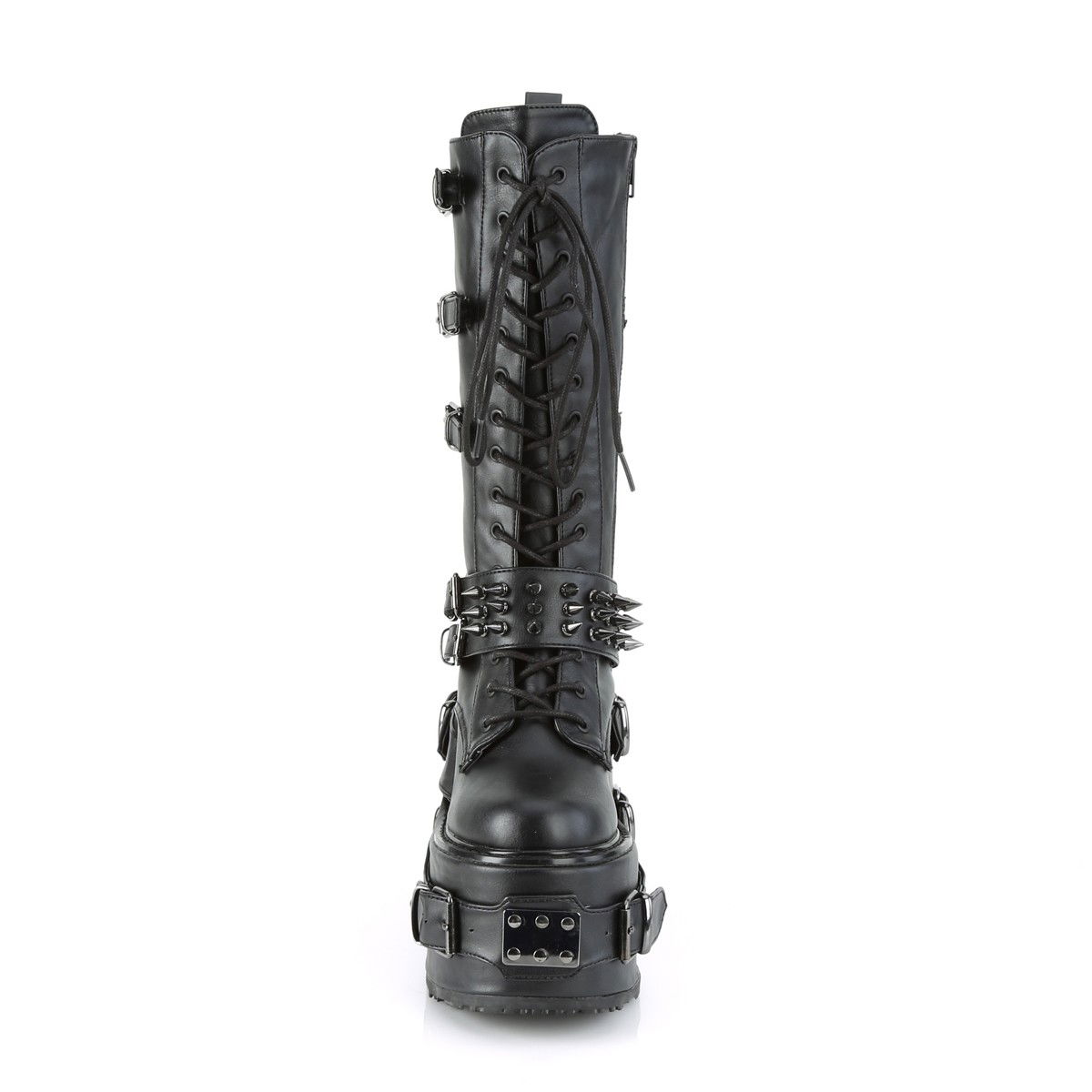 Cizme cu platforma inalta, din piele ecologice, cu detalii metalice, siret in fata si patru catarme, iar alte catarame sunt pe platforma. Cizmele au fermoar pe interiorul piciorului. Brand Demonia