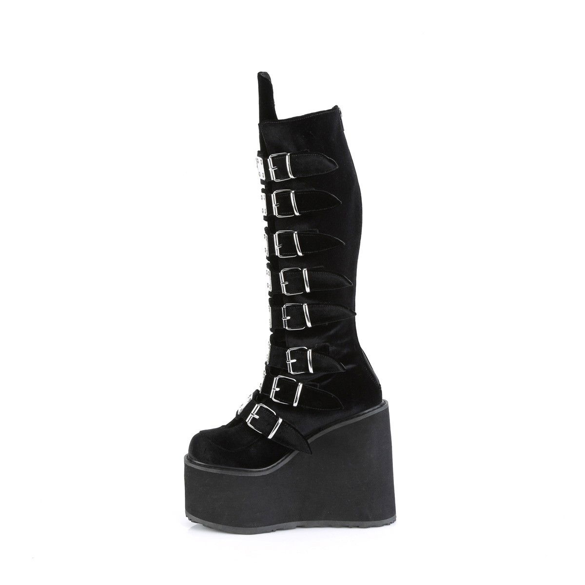 Cizme cu platforma inalta, fara toc, cu catarame, din catifea. Cizme brand Demonia