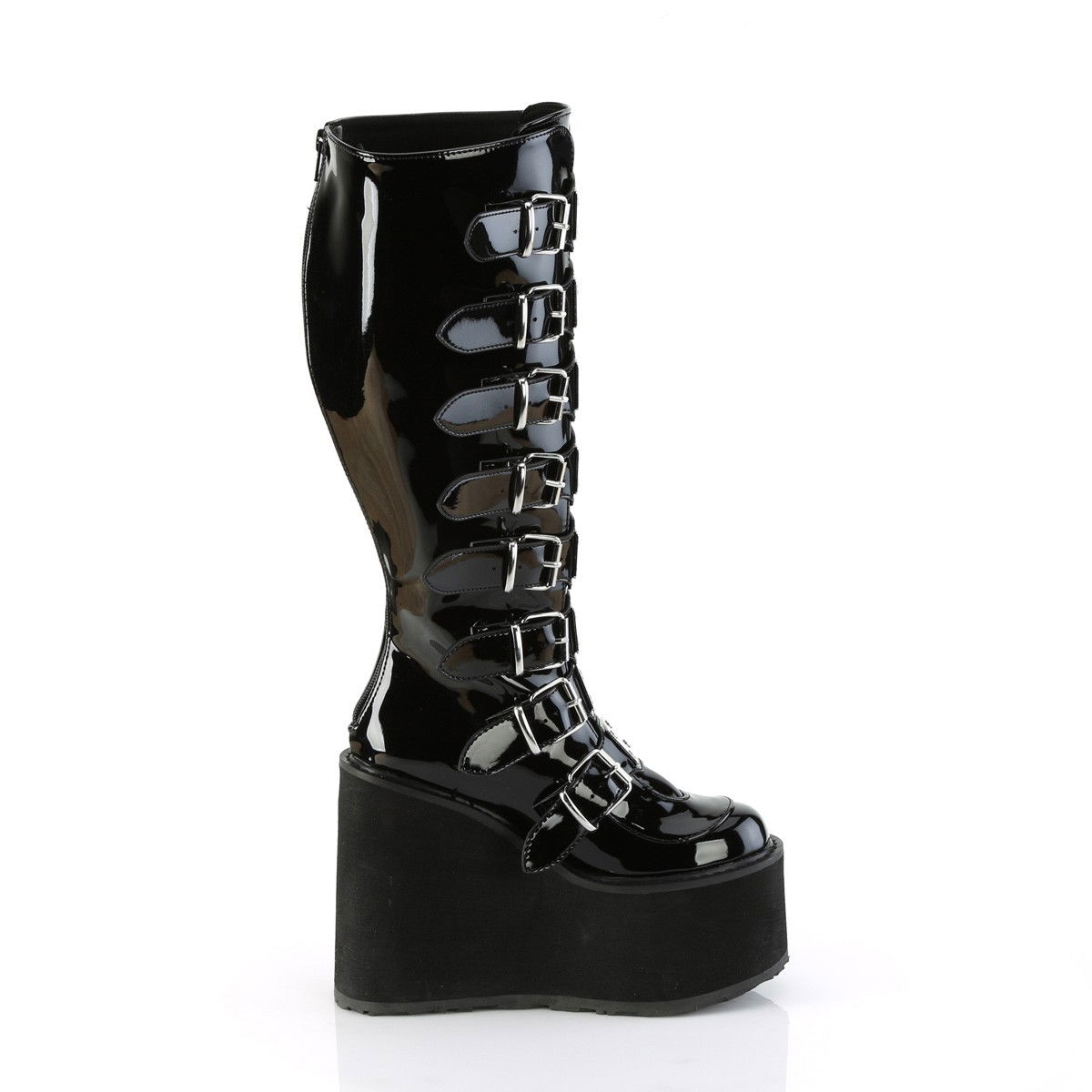 Cizme cu platforma inalta, fara toc, cu catarame, din lac. Cizmele sunt mai largi pe pulpa pentru persoane cu piciorul mai gros. Cizme brand Demonia
