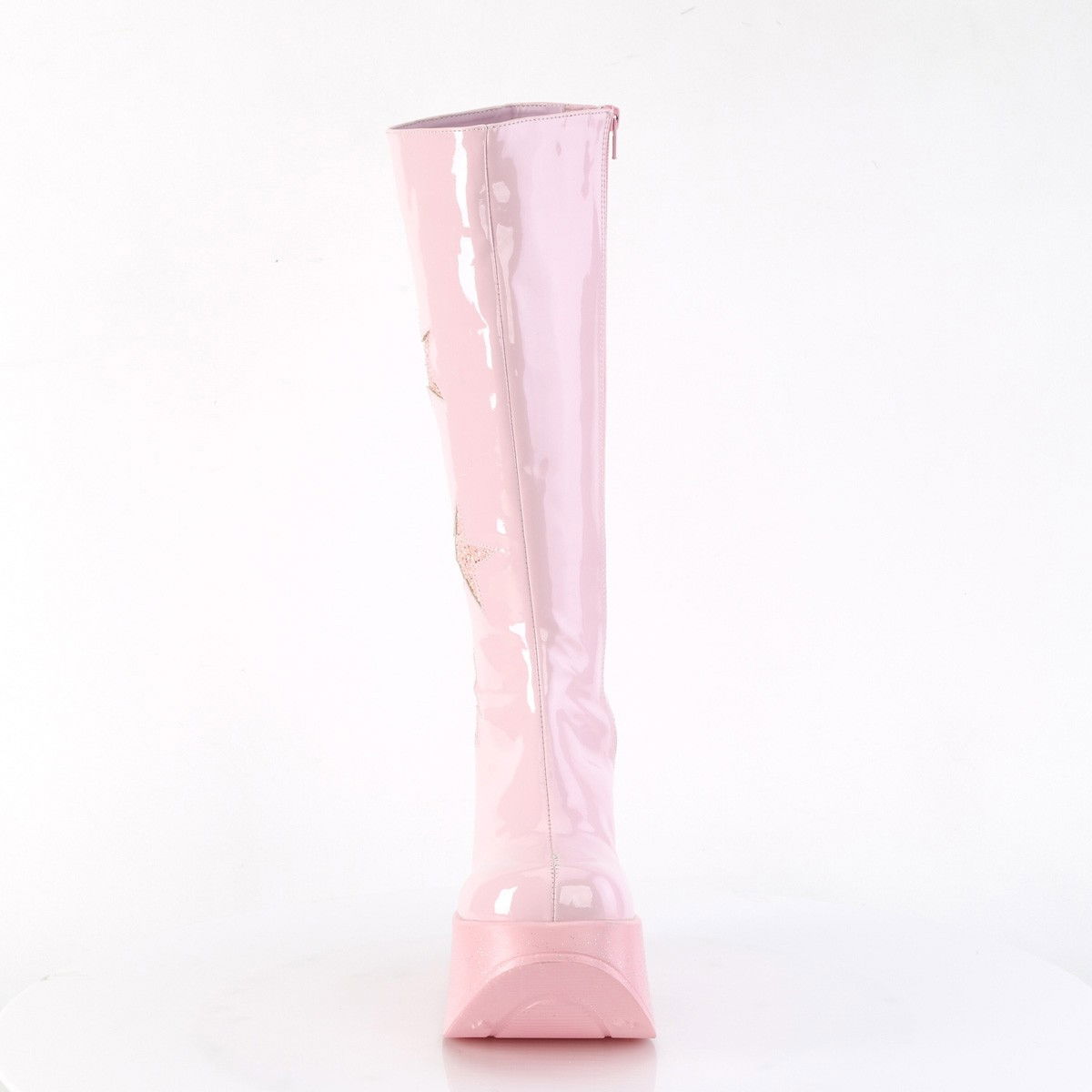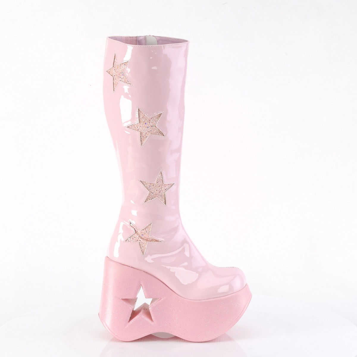 Cizme stil gothic, cu o stea decupata in talpa, fermoar pe interiorul piciorului. Cizmele au stele cu glitter pe lungimea lor. Au talpa ortopedica. Brand Demonia