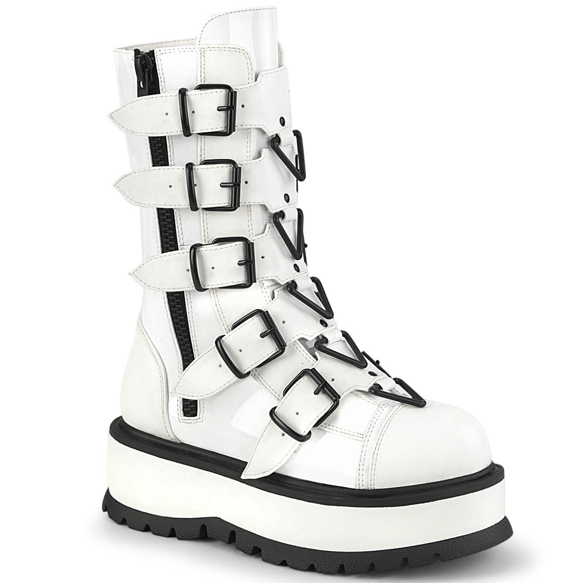 Ghete cu talpa lata, stil gotic, din piele ecologica cu insertie de material lacuit, cu fermoar pe o parte a piciorului, 5 berete cu accesorii metalice in forma tringhiulara. Ghetele comode, cu talpa inalta. Brand Demonia