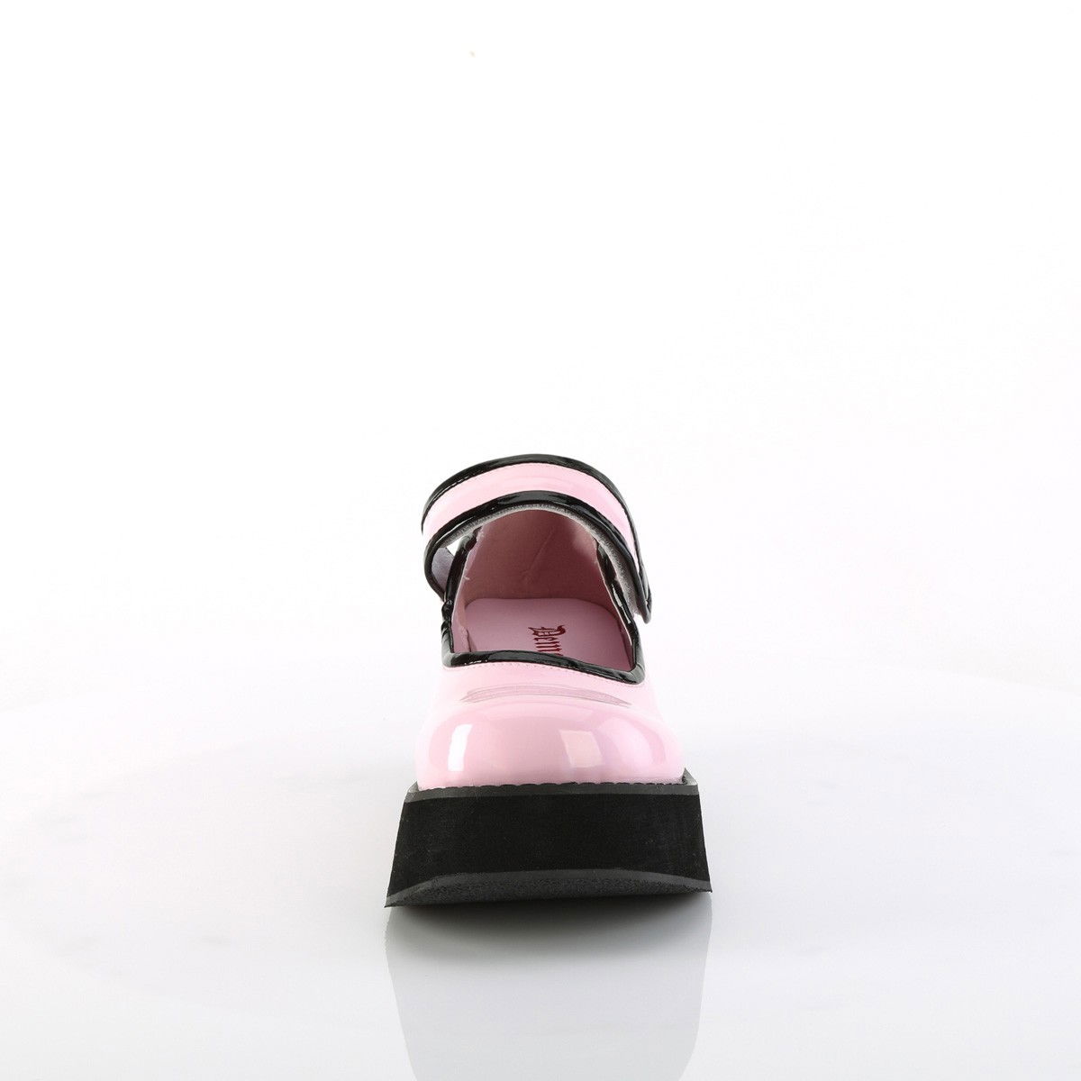 Pantofi cu talpa lata, fara toc, din lac, cu bareta cu scai. Pantofi stil gotic, brand Demonia