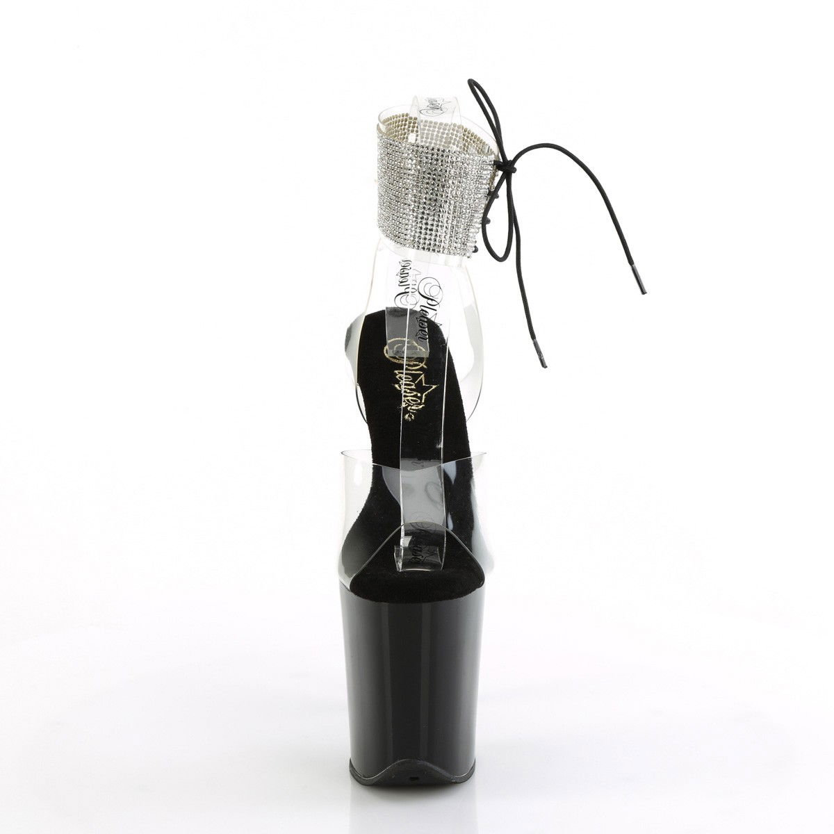 Sandale cu toc inalt, cu bareta cu pietricele pe glezna, care se incheie cu siret lateral. Brand Pleaser
