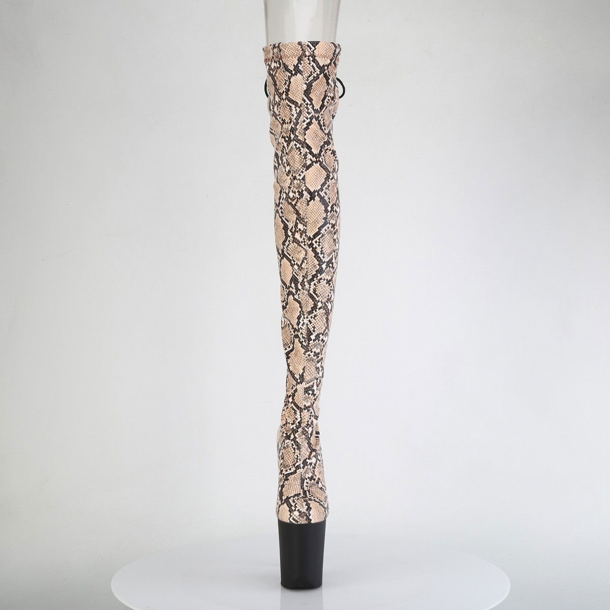 Cizme peste genunchi, strech, pentru dansatoare, cu toc inalt si platforma inalta, model snake print, cu siret in spate. Brand Pleaser USA.