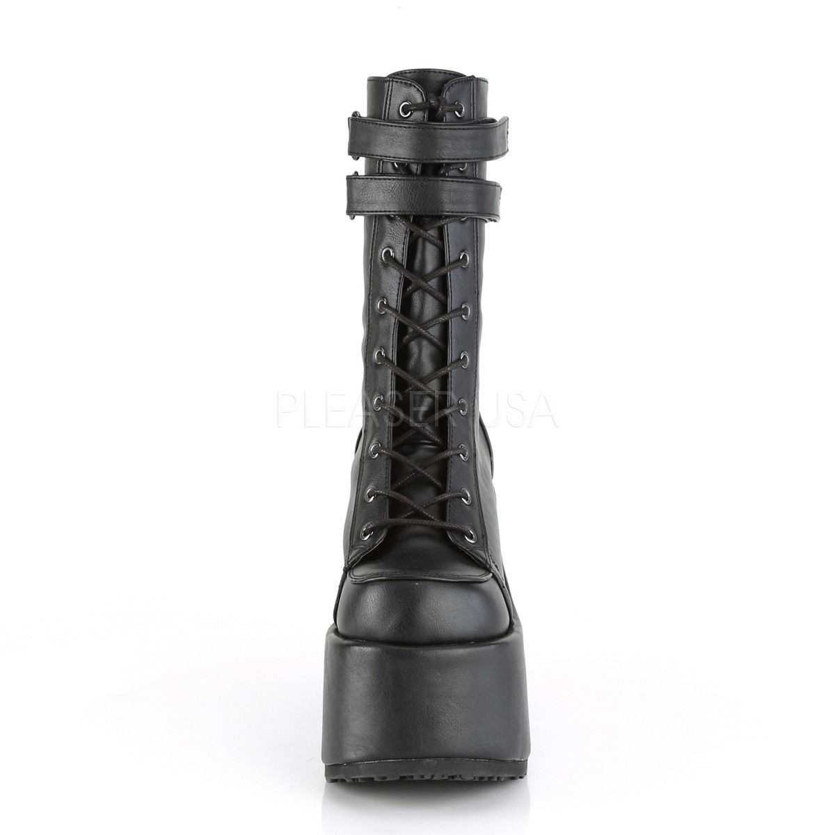Ghete din piele cologica, cu toc gros si platforma inalta, cu siret in fata stil gotic, brand Demonia