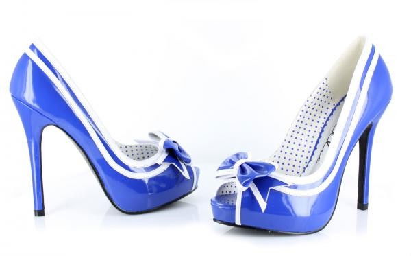 Pantofi retro, rockabilly, pin up, culoare albastru cu dungulita alba. Pantofi comozi, brand Ellie shoes. Pantofi cu platforma mica si toc mediu