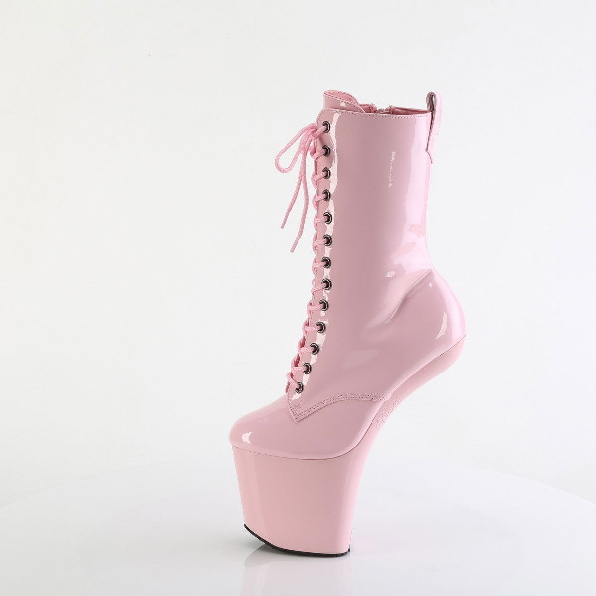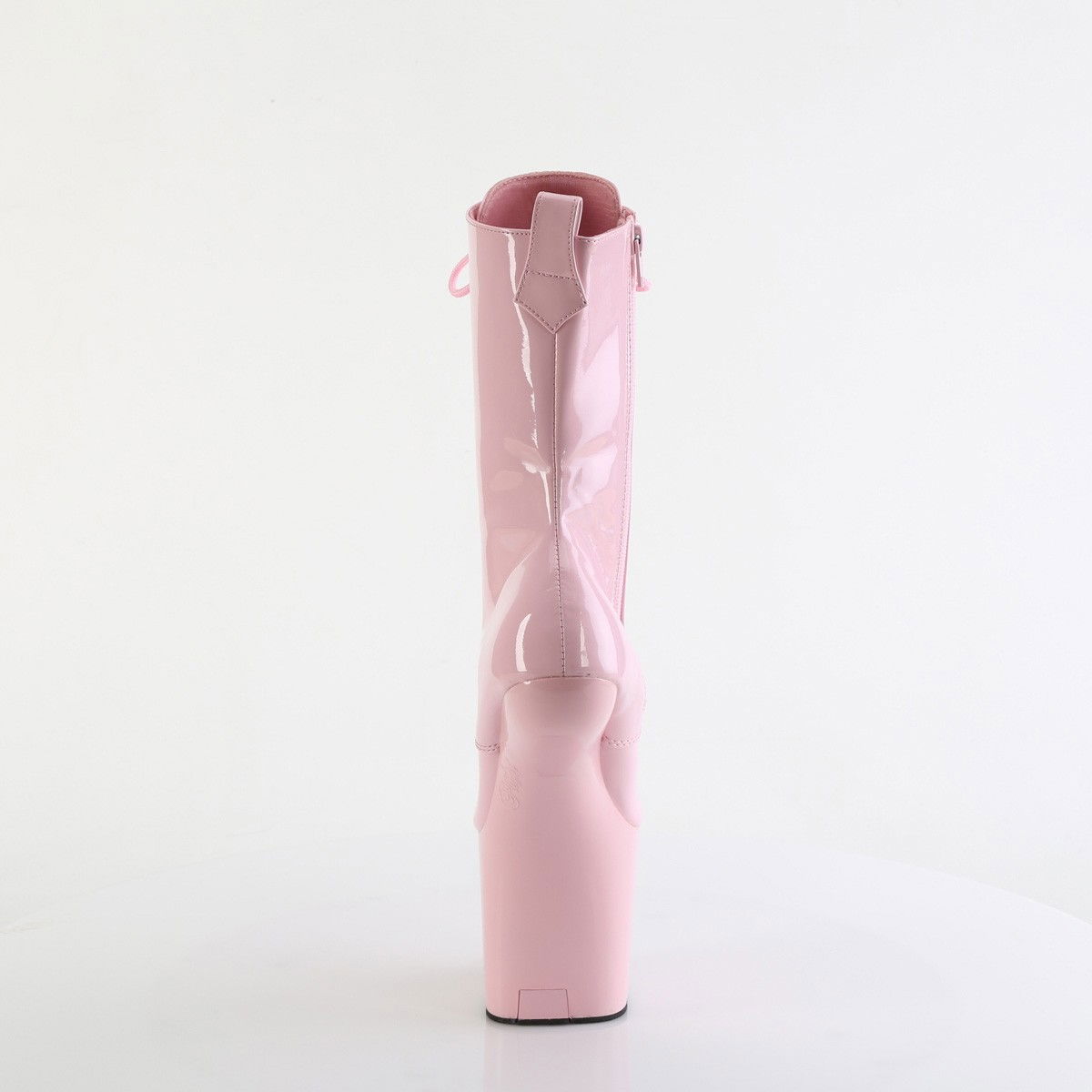Botine fără toc cu înălțime de 20 cm, cu platforma de 7.6 cm, din lac, cu fermoar pe interiorul piciorului. Botine pentru club. Brand Pleaser.