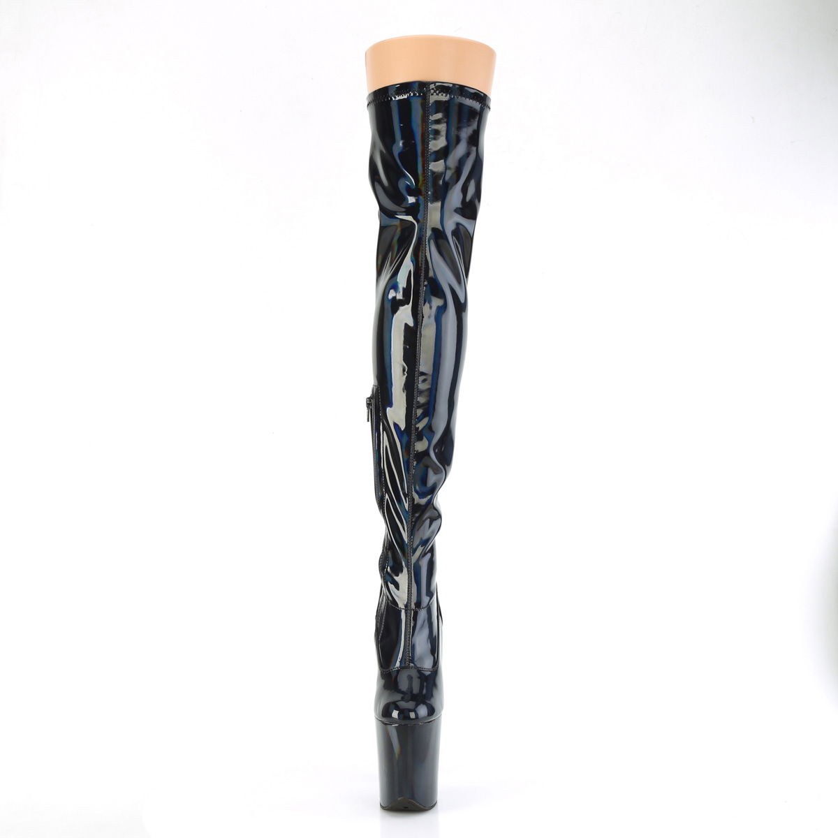 Cizme peste genunchi cu toc inalt de 20.3 cm, negru holograma. Cizme speciale pentru spectacol, fetish, cu fermoar scurt pe interiorul piciorului si cu platforma inalta. Cizme perfecte pentru pole dance si dans la bara. Brand Pleaser USA