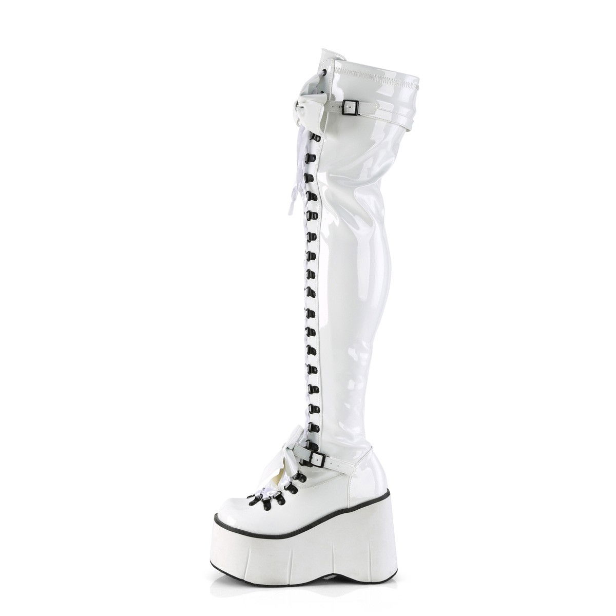 Cizme peste genunchi cu platforma inalta, fara toc, cu siret in fata si o catarama si doua funde mari, fermoar pe interiorul piciorului, stil gotic, din piele ecologica lacuita. Brand Demonia
