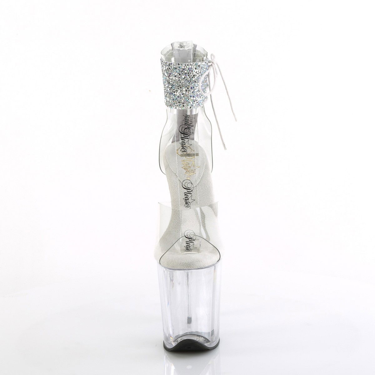 Sandale pentru dansatoare, cu toc inalt si platforma inalta, cu bareta la glezna cu pietricele stralucitoare, cu siret pe lateral, cu fermoar in spate. Brand Pleaser.