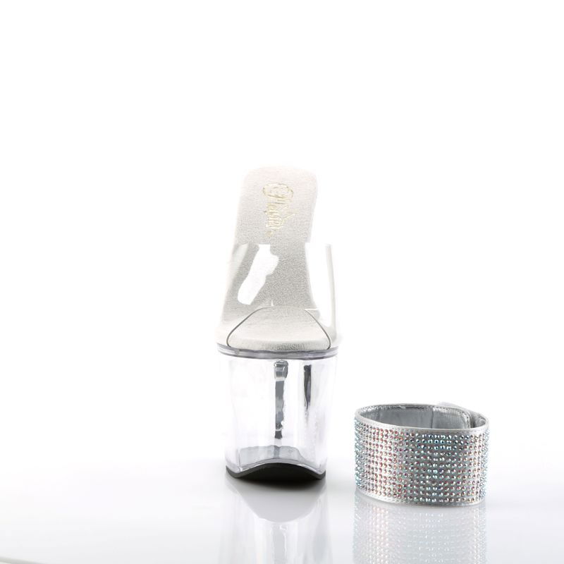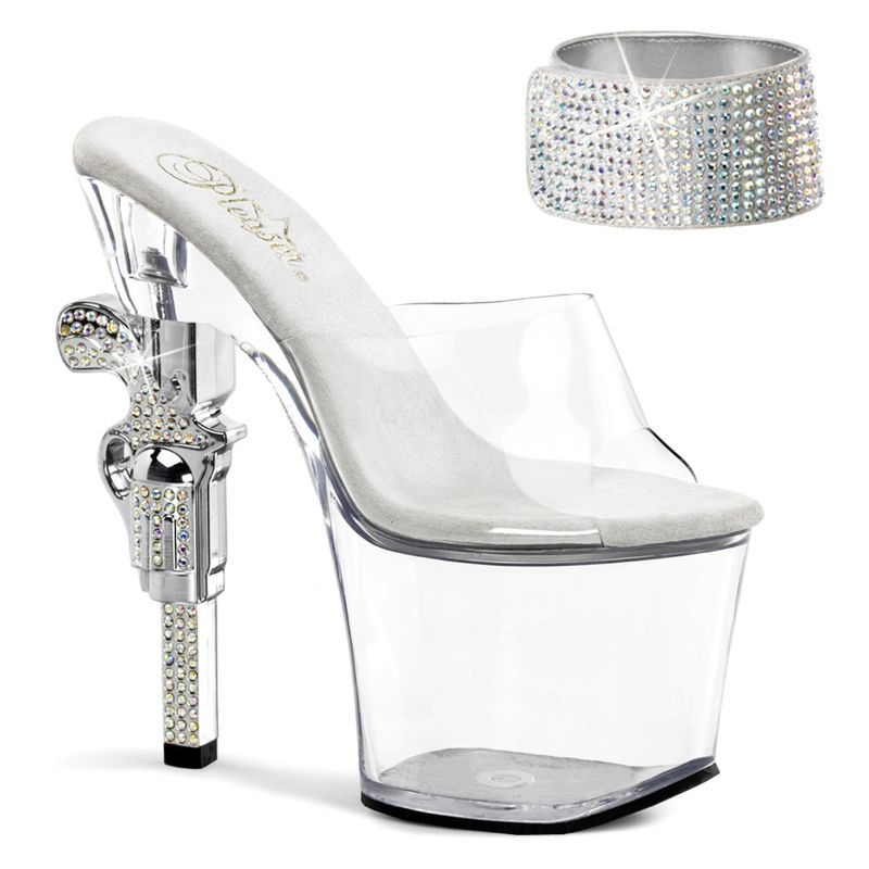 Sandalele sunt realizate în nuanță alb transparent, cu accente strălucitoare datorită pietricelelor aplicate atât pe toc, cât și pe manșeta detașabilă de gleznă. Acest detaliu transformă modelul într-o alegere ideală pentru show-uri, competiții de pole dance și performance exotic. Bareta din silicon poate fi lărgită daca piriorul este mai lat