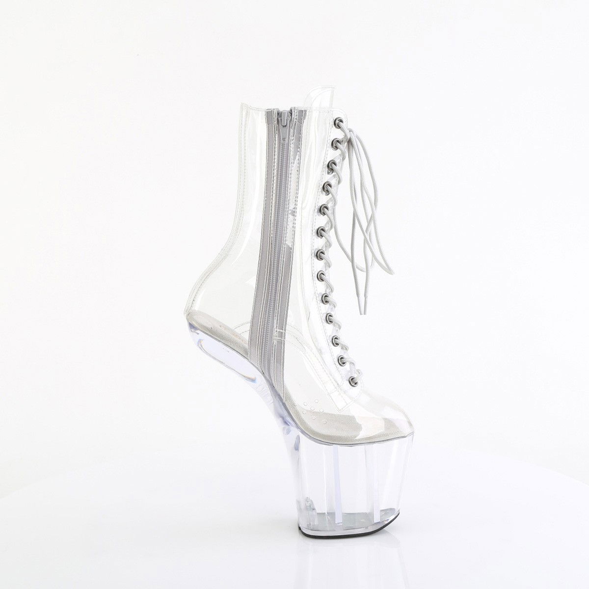 Botine fără toc cu înălțime de 20 cm, cu platforma de 7.6 cm, din lac, cu fermoar pe interiorul piciorului. Botine pentru club. Brand Pleaser.