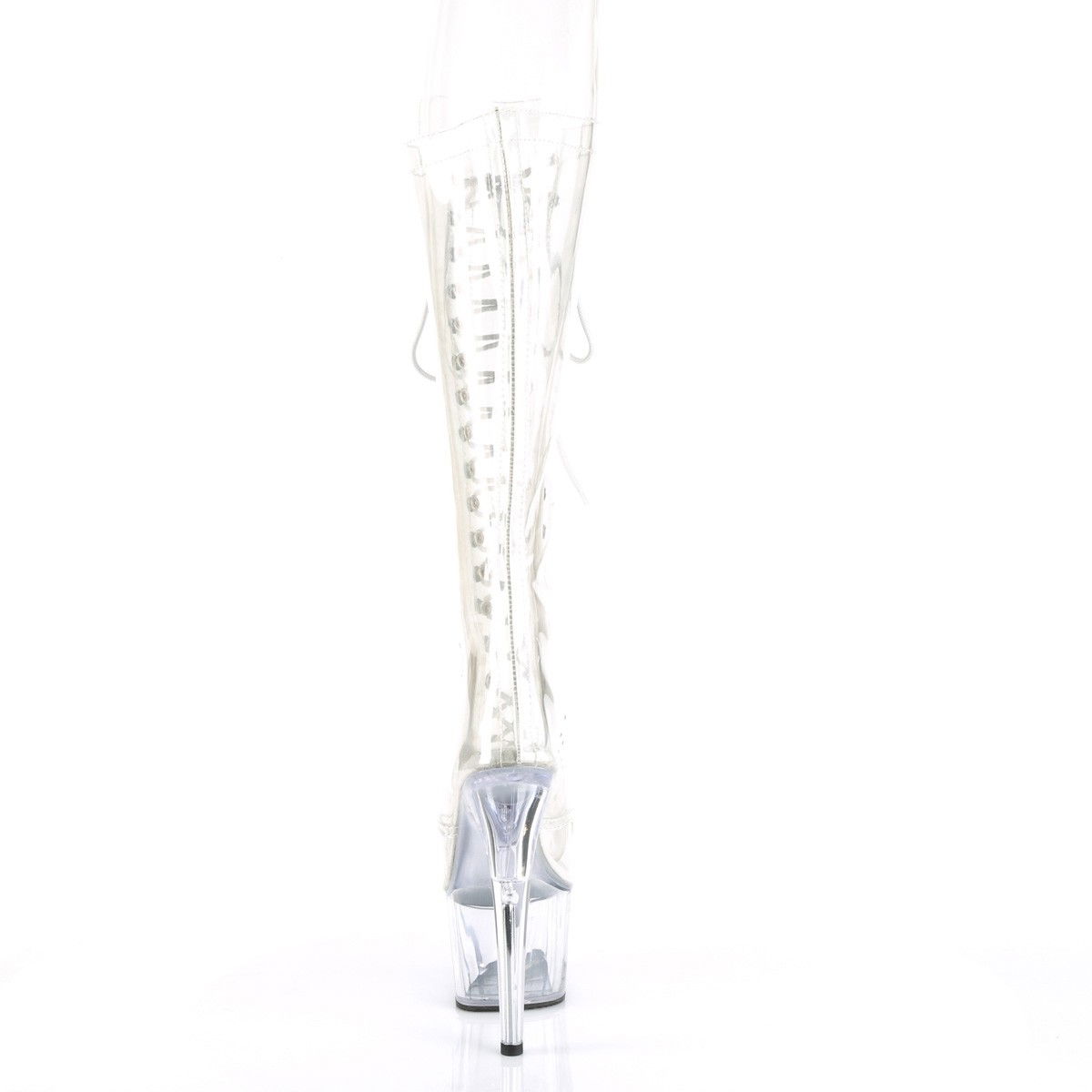 Cizme transparente cu platforma inalta, sub genunchi, mulate pe picior, cu fermoar pe interior si cu varful decupat. Brand Pleaser USA