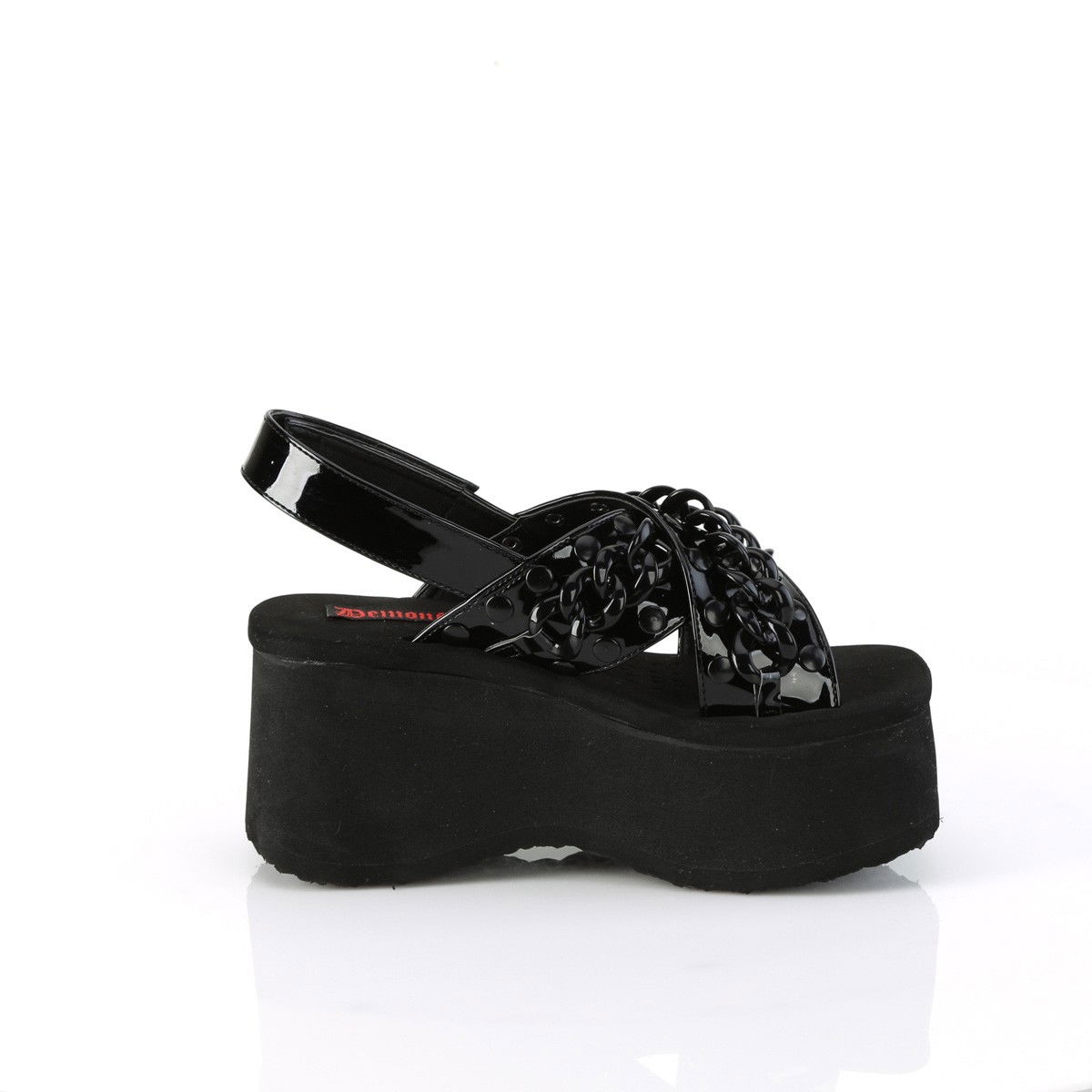 Sandale cu talpa lata, fara toc, stil gotic, cu lant decorativ pe baretele incrucisate. Brand Demonia