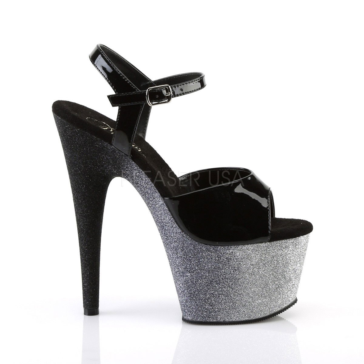 Sandale dansatoare, elegante, cu bareta din lac si platforma cu multe pietricele holograma multicolore, cu piele intoarsa pe talpa