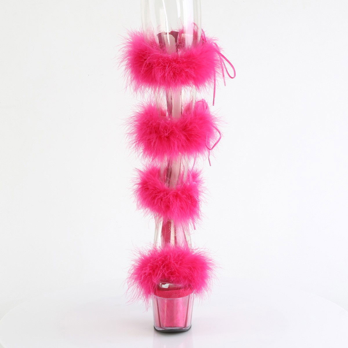 Sandale cu toc de 17.8 cm si platforma de 7 cm, cu barete pe glezna si pe picior. Pe cele patru barete este puf fin, iar la spate sandalele se incheie cu fermoar. Sandale de club, brand Pleaser