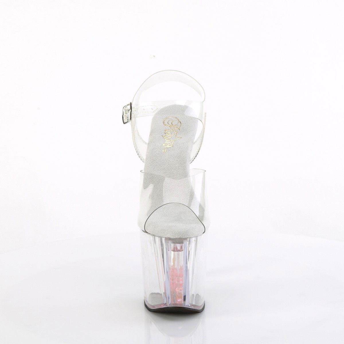 Sandale pentru dansatoare, cu toc inalt si platforma, cu o bareta, cu varful decupat, platforma infuzată cu lichid curgător și inimi, flori și fluturi cu sclipici holografice plutitoare. Brand Pleaser.