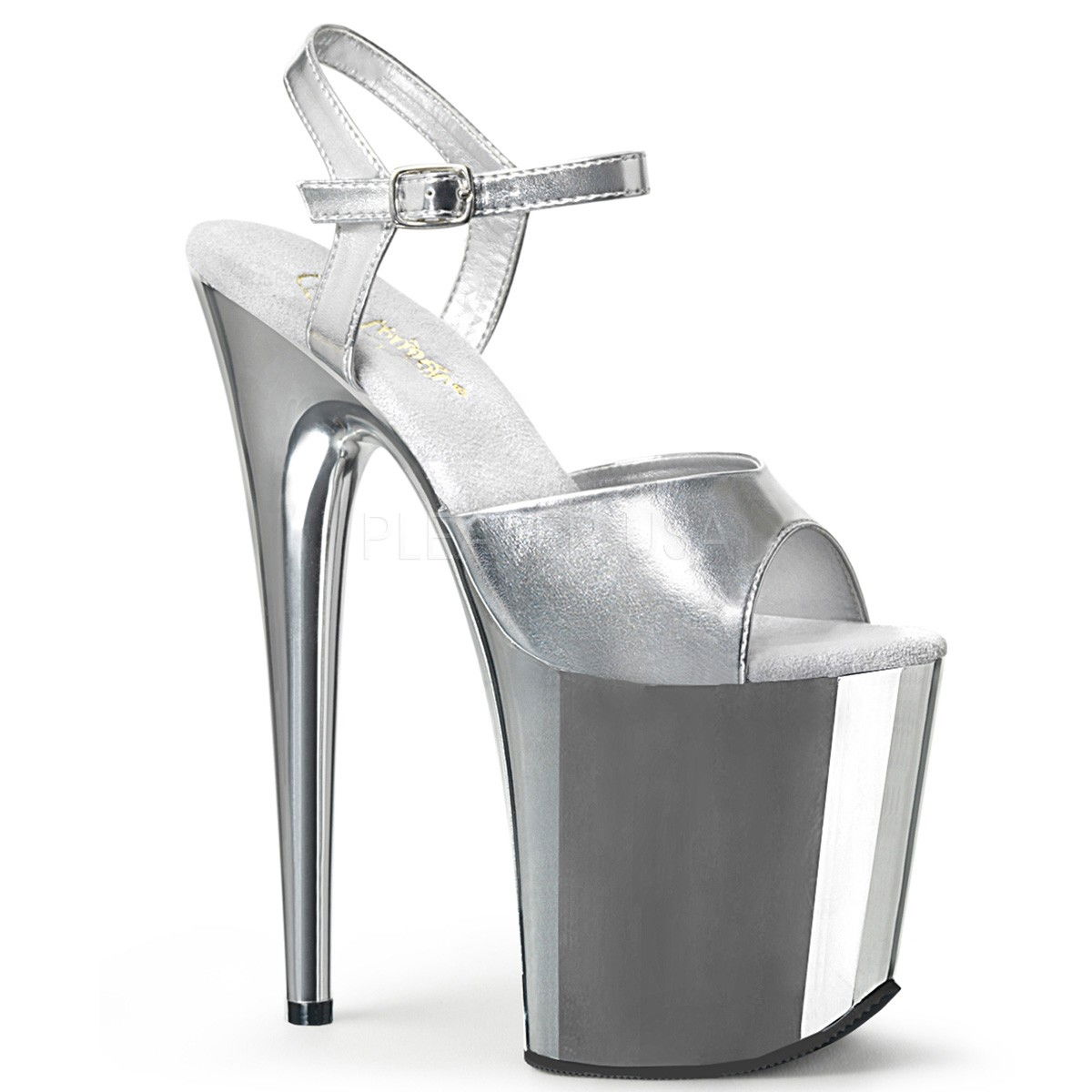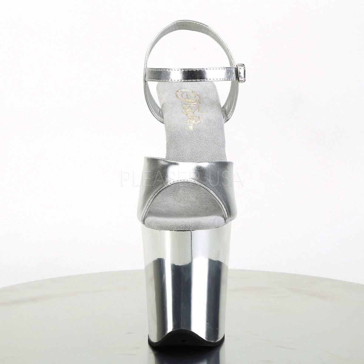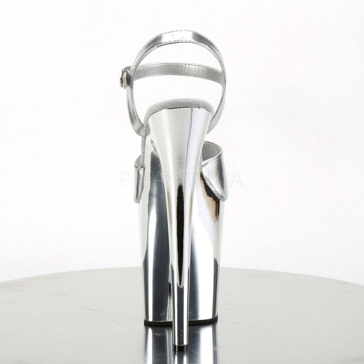 Sandale sexy, cu platforma inalta, cromata, din lac si cu toc inalt. Pe talpa au piele intoarsa pentru ca piciorul sa nu transpire si sa alunece. Brand Pleaser